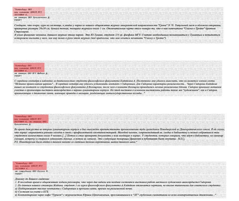 Hətta 1990-cı ilin yanvarında "Moskovskiy Komsomolets" qəzeti Moskva Dövlət Universitetinin tarix fakültəsi tələbələrinin siyasi etibarsızlığı barədə K. Zatulinə OKO əməkdaşlarının raportlarına istinadən məqalə dərc edib (Vadim Poeqli, "1984" və digərləri və ya könüllü istibdad haqda polemik qeydlər” (Вадим Поэгли. "1984" и другие, или полемические заметки о добровольном сыске " -"Московский Комсомолец", 23 января 1990 г.).