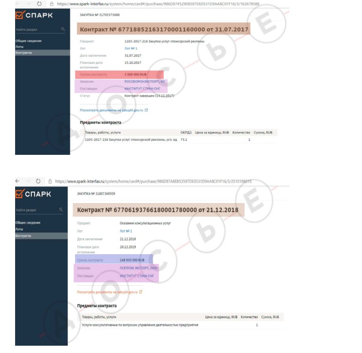 Qeyd edilən qrup əvvəlcə “MDB Ölkələri İnstitutu”nun maliyyələşdirilməsi məsələlərini yoxlayıb. Məlum olub ki, bu qeyri-hökumət təşkilatı, Rusiyanın dövlət şirkəti "Qazprom"un hesabına yaşayır. Onlar “Qazprom Ekspress” və İnstitut arasında bağlanan 10 dekabr 2015-ci il tarixli, "№ ГПЭ-10/12-2015” nömrəli xidməti müqaviləni sertifikatını aşkar ediblər.
