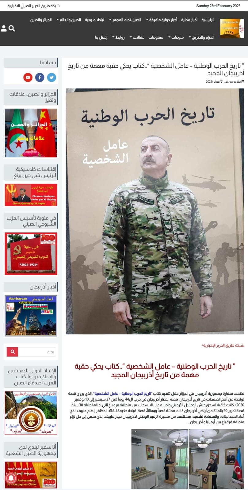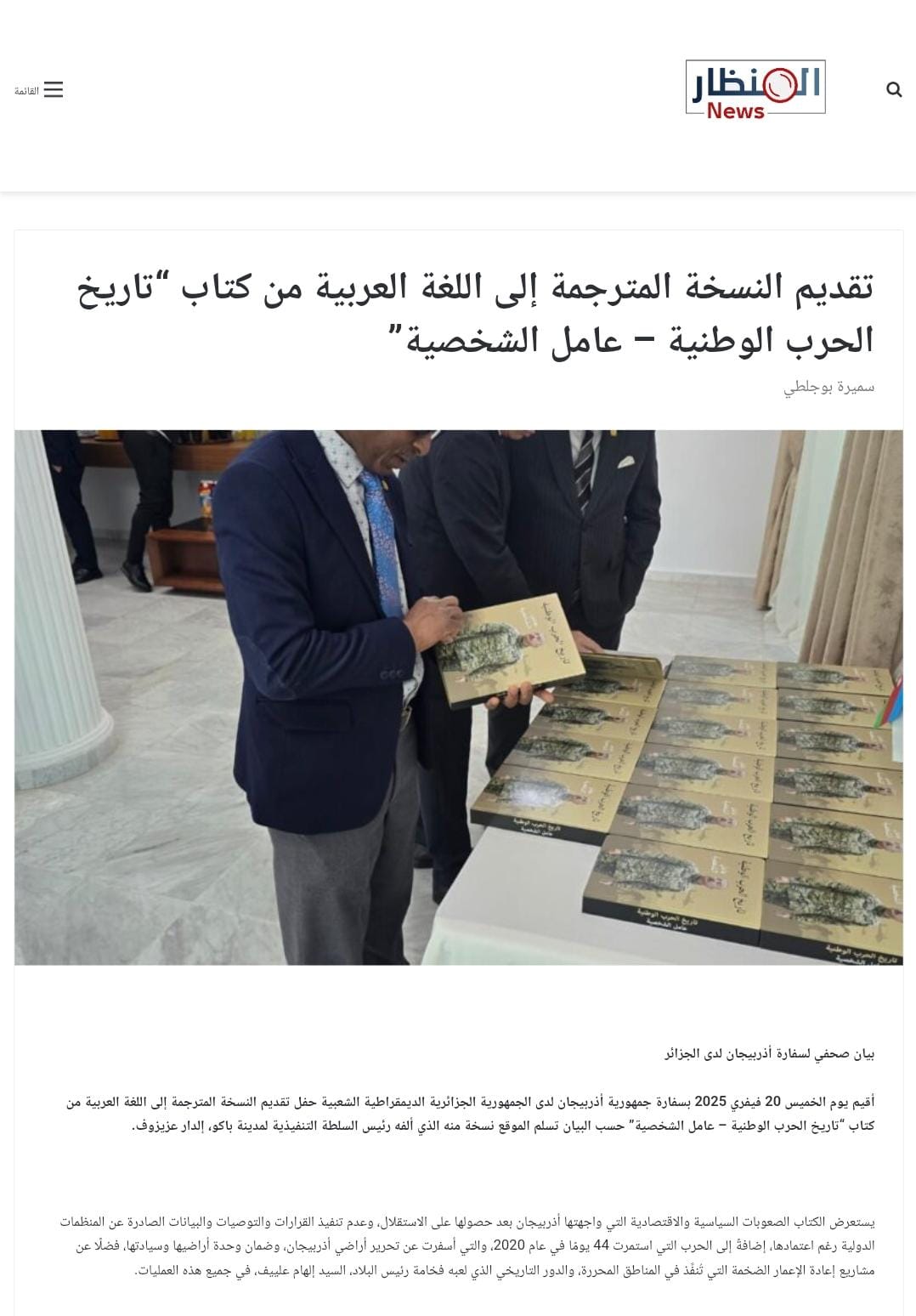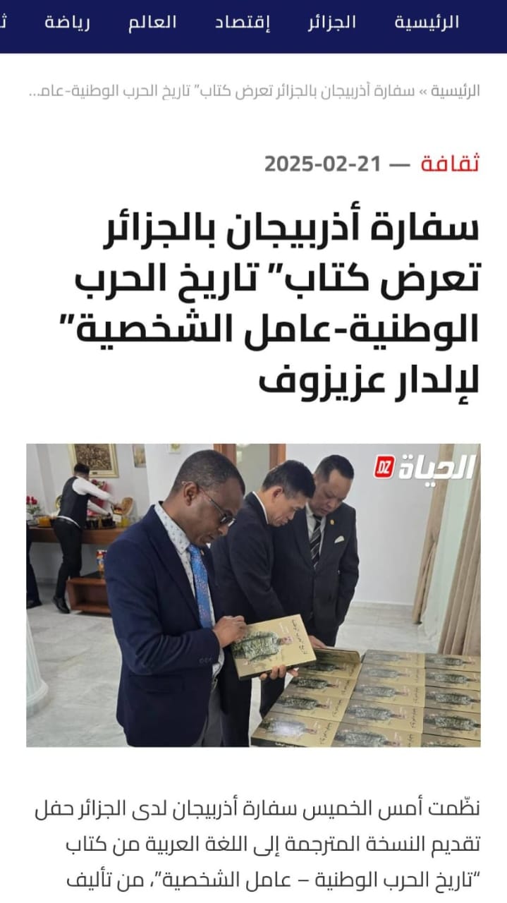 Bakı Şəhər İcra Hakimiyyəti və Tarix İnstitutunun birgə layihəsi olan “Vətən müharibəsi tarixi. Şəxsiyyət faktoru” kitabının ərəb dilində nəşrinin Əlcəzair Xalq Demokratik Respublikasının paytaxtında təqdimat mərasimi keçirilib.