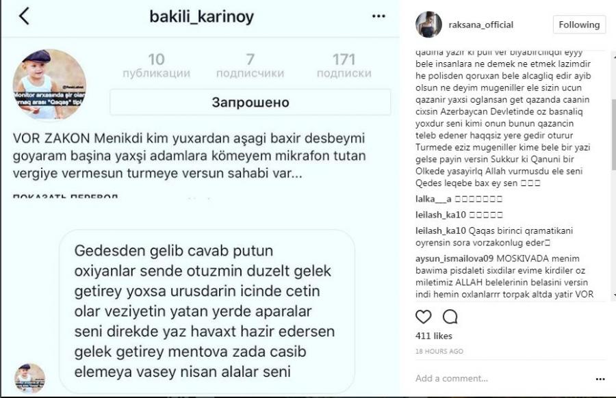Rəqsanə “bakılı_karinoy” adlı profilin şəklini və yazdıqlarını paylaşaraq, bunları qeyd edib: