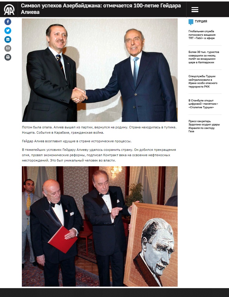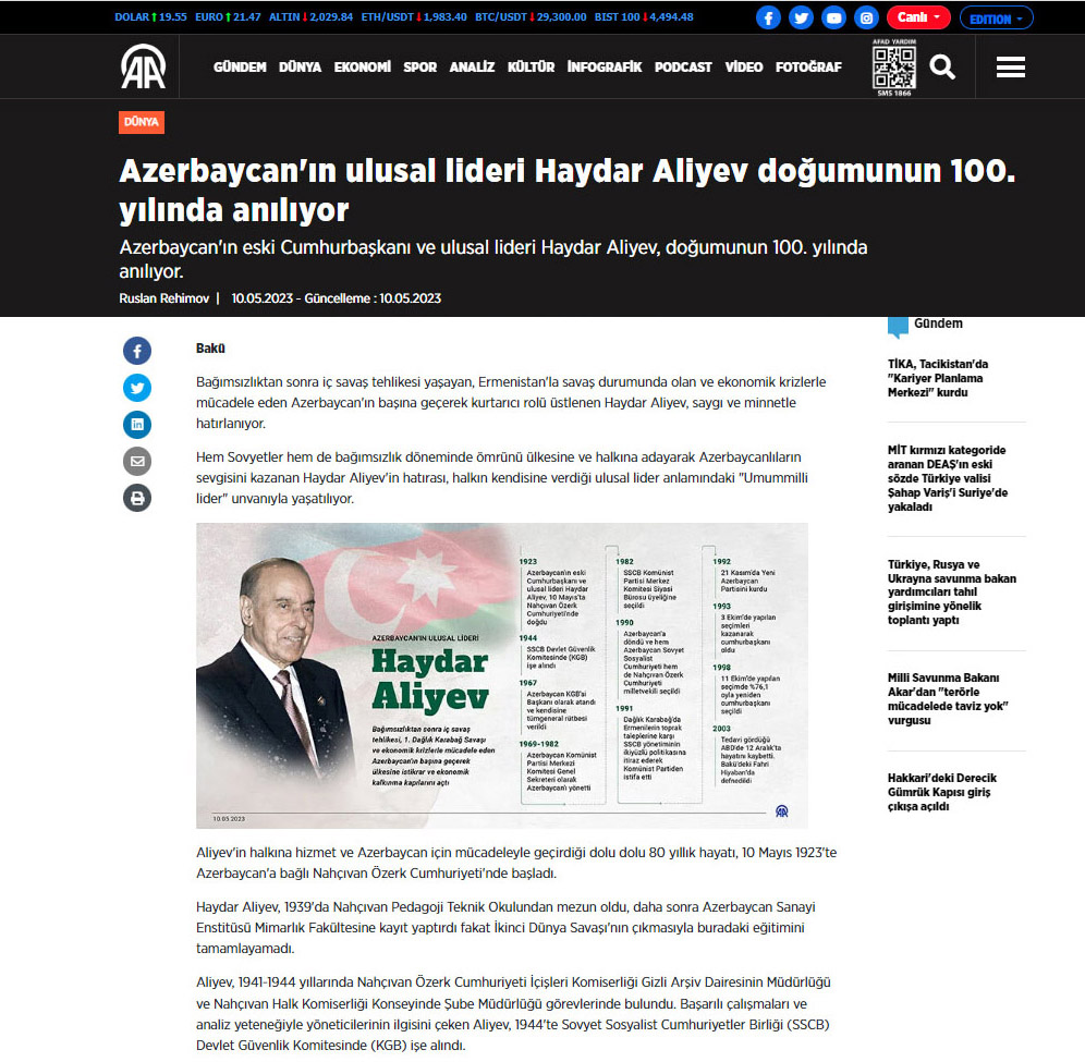 Türkiyənin Anadolu agentliyində yayımlanan “Azərbaycanın Ulu Öndəri Heydər Əliyev anadan olmasının 100-cü ildönümündə anılır” sərlövhəli məqalədə “Şəxsiyyətin ölkənin və xalqın tarixində oynadığı rolu Heydər Əliyevin həyatının timsalında dərk etmək mümkündür” fikri xüsusi vurğulanıb. Məqalədə Ulu Öndər Heydər Əliyevin mənalı həyatı və çoxşaxəli siyasi fəaliyyətinin müxtəlif məqamları, sovet dövründə Azərbaycana rəhbərlik etdiyi, daha sonra SSRİ-də yüksək vəzifədə çalışdığı dövr ətraflı işıqlandırılıb.