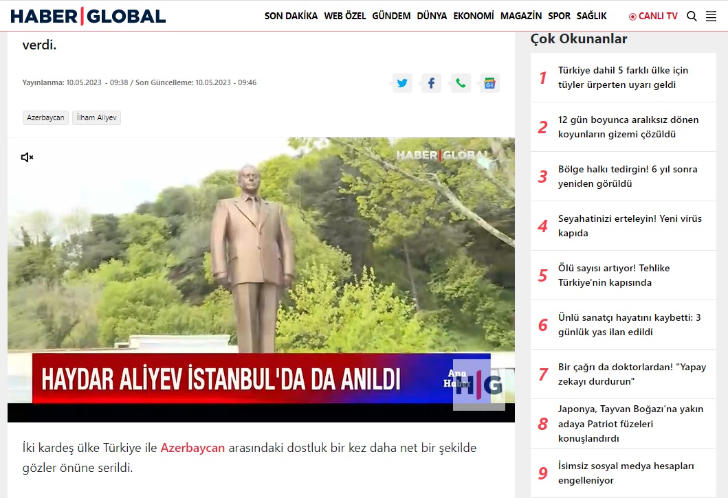 “HaberGlobal” televiziyasında Ulu Öndər Heydər Əliyevin anadan olmasının 100 illiyi münasibətilə İstanbul, Ankara və digər şəhərlərdə keçirilən silsilə tədbirlərdən söz açılıb, Türk dünyasının böyük oğlu, Ümummilli Liderin xatirəsinin qardaş ölkədə də ən yüksək ehtiramla yad edildiyi vurğulanıb.