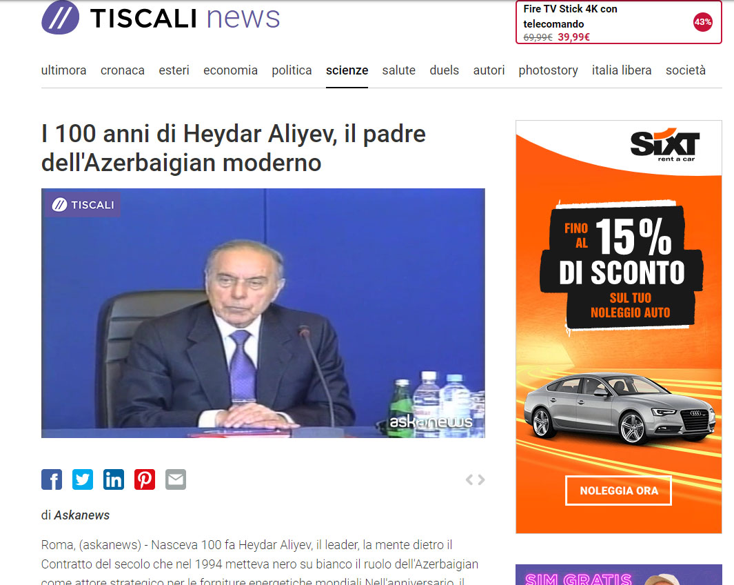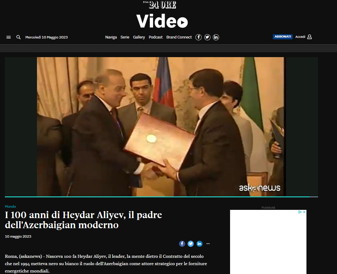 İtaliyanın aparıcı kütləvi informasiya vasitələrində Azərbaycan xalqının dahi Lideri, Ulu Öndər Heydər Əliyevin anadan olmasının 100-cü ildönümü ilə əlaqədar məqalələr dərc olunub. “Il Sole 24 Ore” televiziyasının, “Libero”, “Notizie Tiscali”, “Askanews”, “Insideover”, “Agenzia Nova” informasiya agentliklərinin yaydığı materiallarda Ümummilli Liderin xilaskarlıq və quruculuq missiyasından, Azərbaycan xalqının ictimai-siyasi həyatında və dövlətçilik tarixindəki misilsiz rolundan bəhs edilib.