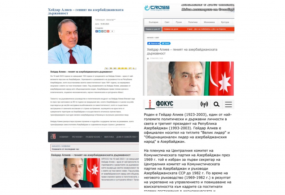 Ulu Öndər Heydər Əliyevin 100 illik yubileyi Bolqarıstan mətbuatında da geniş işıqlandırılıb. Bu ölkənin müxtəlif xəbər saytlarında, o cümlədən “Cross.bg”, “novini247” yayımlanan məqalələrdə Ümummilli Lider Heydər Əliyevin uzaqgörənliyi, zəngin idarəçilik təcrübəsi və siyasi müdrikliyi ilə tam bir dövlətçilik dahisi olduğu bildirilir. Azərbaycanın dövlət müstəqilliyini bərpa etdiyi ilk illərdə Ermənistanın hərbi təcavüzünə məruz qaldığı, suveren ərazilərinin 20 faizinin işğal edildiyi, etnik təmizləmə nəticəsində kütləvi şəkildə qaçqın və məcburi köçkün problemi ilə üzləşdiyi bir zamanda məhz Heydər Əliyevin səyləri ilə məhv olmaq təhlükəsindən qurtulduğu qeyd edilib. Ümummilli Liderin başlatdığı hərtərəfli islahatlar sayəsində müstəqil Azərbaycanın müasir və dinamik inkişaf edən güclü dövlətə çevrildiyi bildirilib, habelə onun müəllifi olduğu enerji strategiyasının Azərbaycanı çiçəkləndirməklə yanaşı, o cümlədən beynəlxalq miqyasda ölkəmizin etibarlı tərəfdaş kimi tanınmasına əsas yaratdığı diqqətə çatdırılıb.