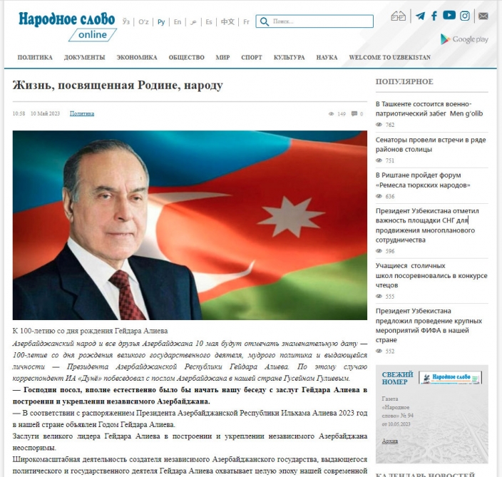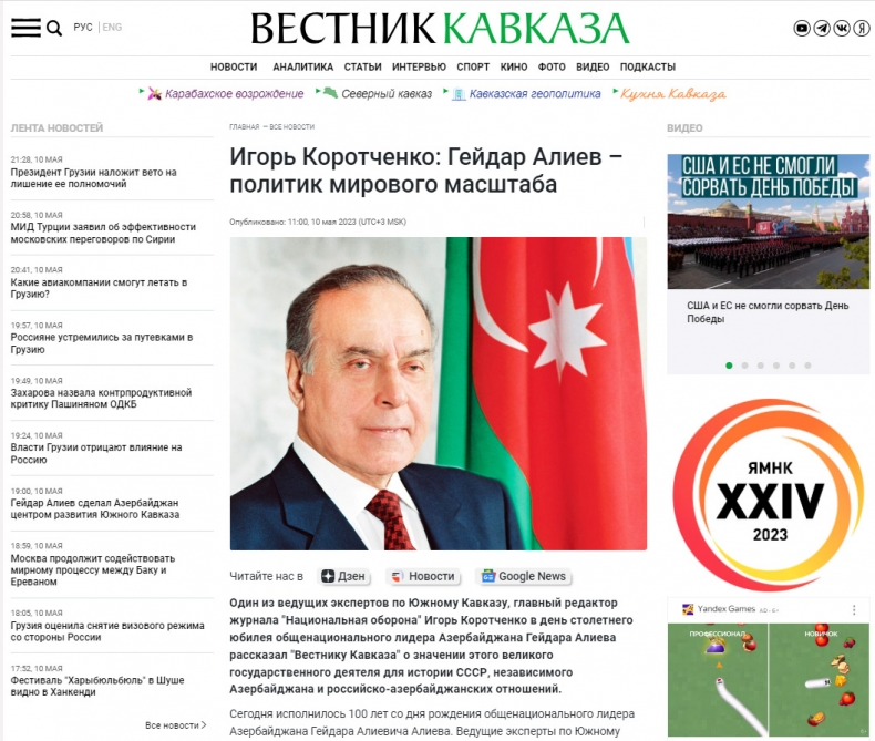 “News.ru” nəşrinin “Müdrik və uzaqgörən lider: Heydər Əliyev tarixin yaddaşında necə qalıb?” adlı məqaləsində 2023-cü ilin Azərbaycanda “Heydər Əliyev İli” elan olunduğu bildirilir. Nəşr yazır ki, Ulu Öndərin Azərbaycana rəhbərlik etdiyi illər ölkənin yüksəliş dövrü olub. Məqalədə Rusiya xarici işlər nazirinin keçmiş müavini Qriqori Karasin, Rusiya XİN-in rəsmi nümayəndəsi Mariya Zaxarova, 2001-2009-cu illərdə Moldovanın Prezidenti olmuş Vladimir Voronin və başqalarının Heydər Əliyev haqqında fikirləri yer alıb.