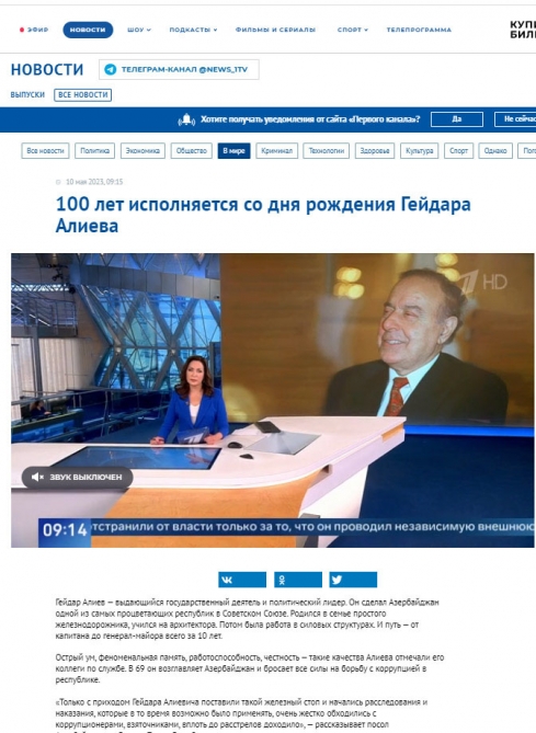 Rusiyanın Birinci televiziya kanalının Ümummilli Liderin yubileyi münasibətilə hazırladığı süjetdə Heydər Əliyevin Azərbaycan xalqı qarşısında misilsiz xidmətlərindən danışılıb. Azərbaycanın Rusiyadakı səfiri Polad Bülbüloğlu tamaşaçılarla öz xatirələrini bölüşüb.