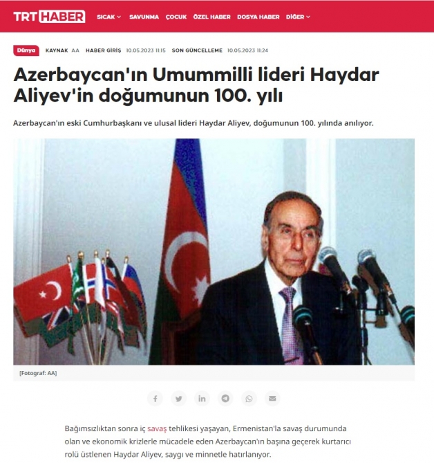 Türkiyənin “TRT Haber” kanalının saytında yayımlanan məqalədə isə 80 illik ömrünü xalqına xidmətə həsr etmiş Heydər Əliyevin Azərbaycanın ən çətin anlarında xalqının yanında olduğu, doğma Vətənini hər cür bəlalardan qoruyaraq dinamik inkişaf yoluna çıxardığı bildirilib. Məqalədə Azərbaycan xalqının böyük oğlunun xatirəsini daim ən dərin ehtiramla yad etdiyi vurğulanıb, 2023-cü ilin Azərbaycanda “Heydər Əliyev İli” elan olunduğu, ilin əvvəlindən başlayan silsilə tədbirlərin il ərzində davam etdiriləcəyi əksini tapıb.