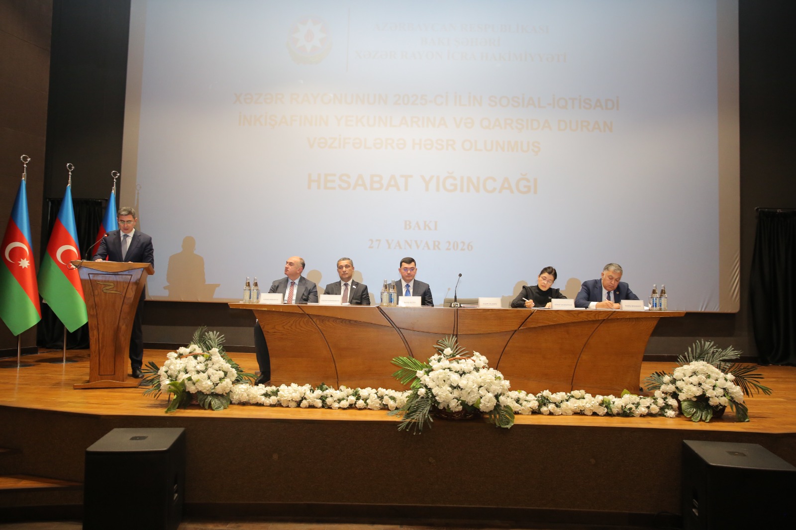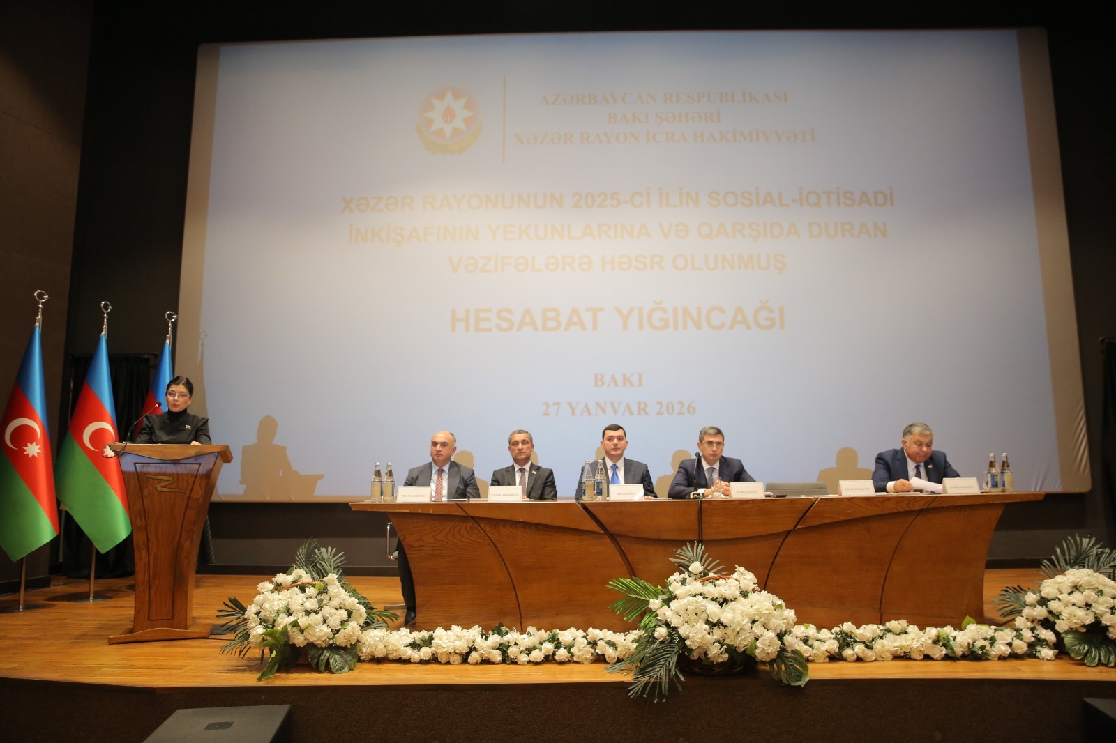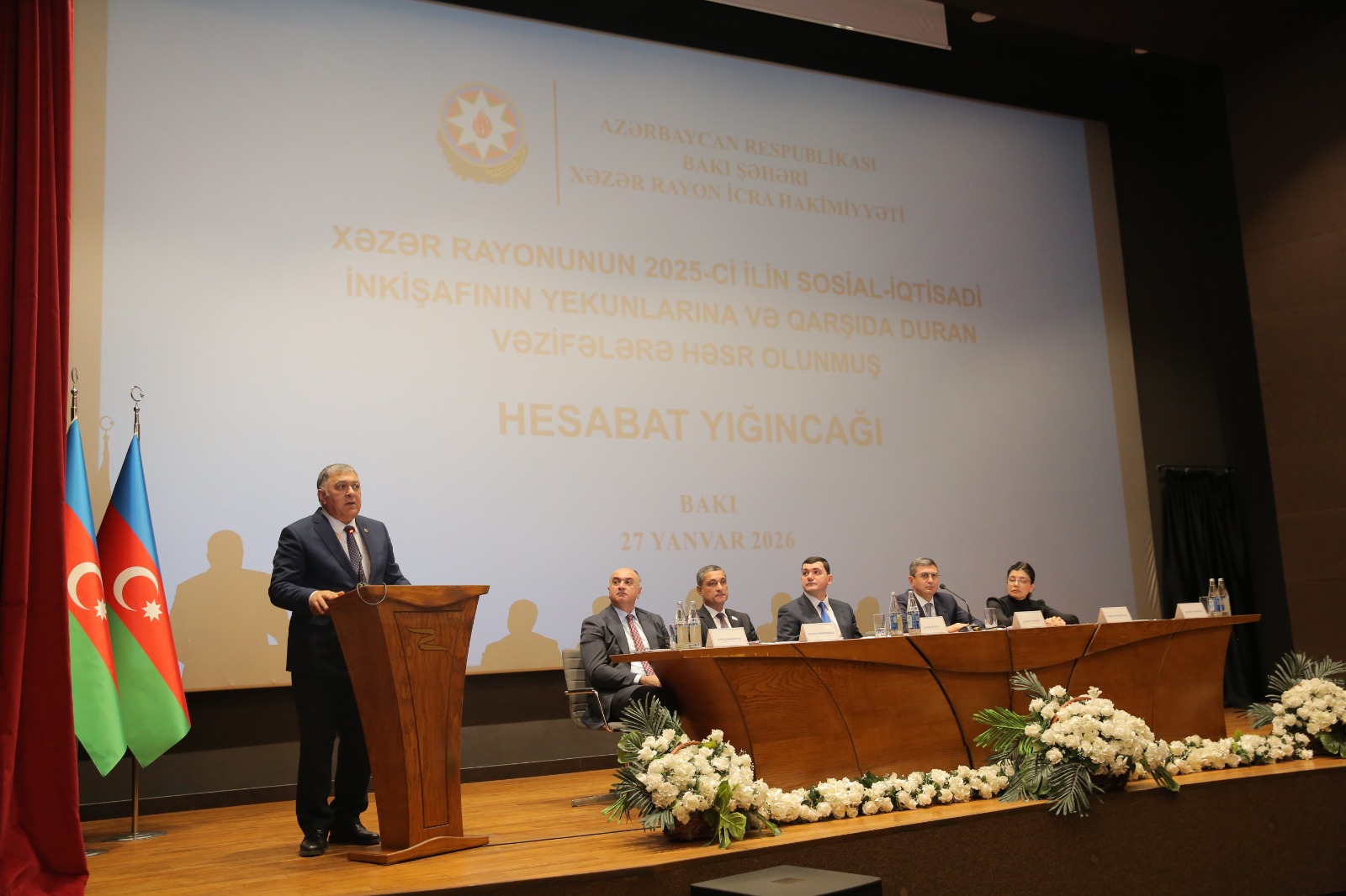 Xəzər Rayon İcra Hakimiyyətinin başçısı Elşən Salahov tədbirdə geniş məruzə ilə çıxış edərək 2025-ci il üzrə görülmüş işlər, sosial-iqtisadi nəticələr və qarşıda duran prioritetlər barədə məlumat verib. O qeyd edib ki, 2025-ci il Azərbaycan dövlətçiliyi tarixində mühüm mərhələ kimi yadda qalıb, Azərbaycan Prezidenti İlham Əliyevin həyata keçirdiyi siyasi kursun davamlılığı ölkənin bütün istiqamətləri üzrə sosial-iqtisadi inkişafın yeni mərhələsinə keçidə şərait yaradıb.