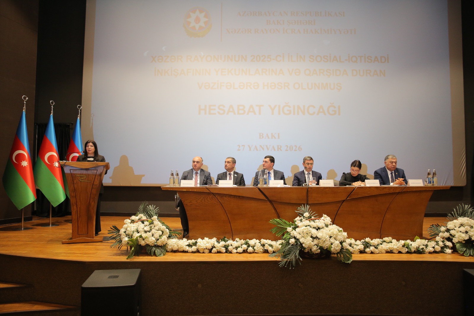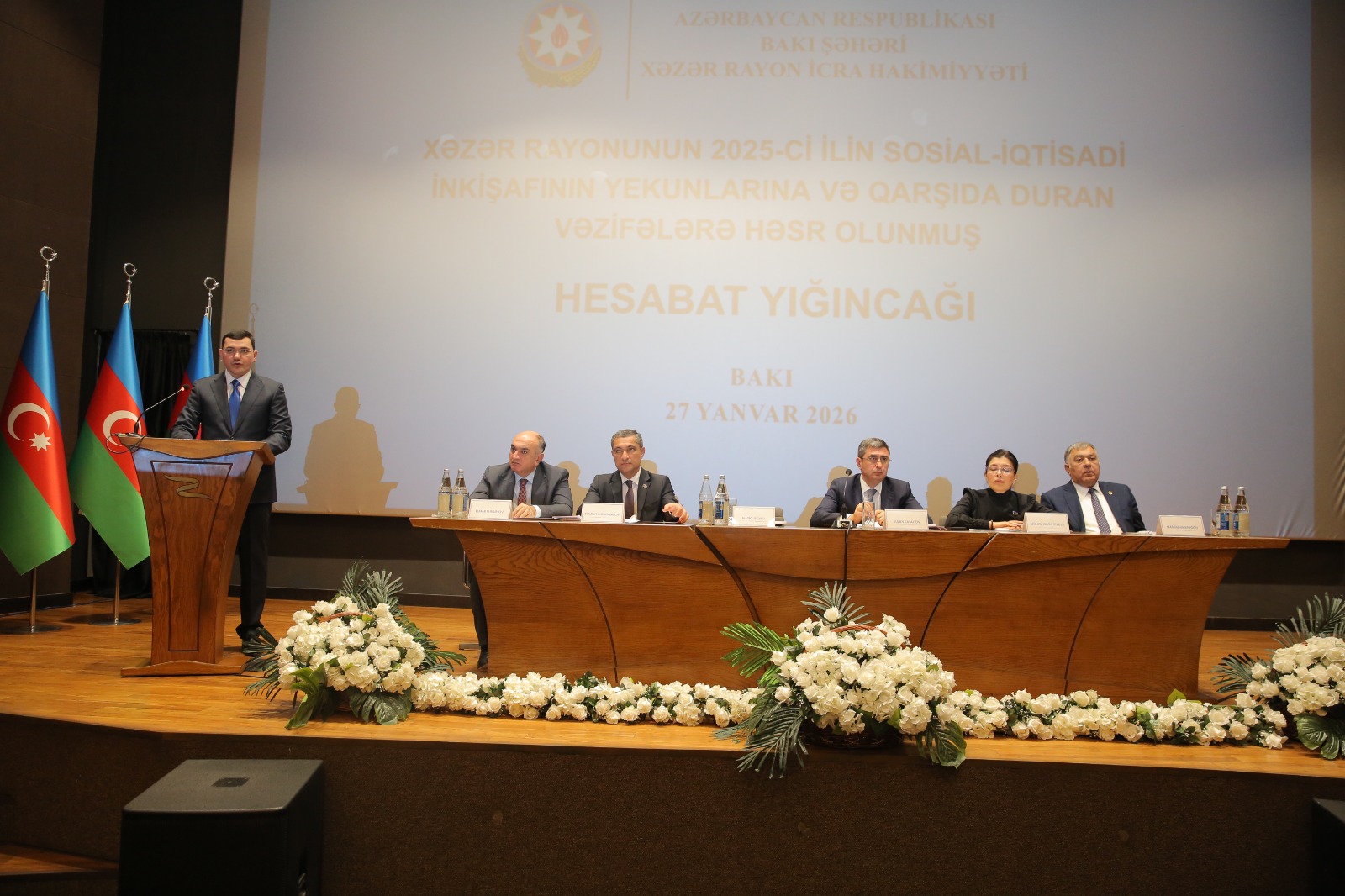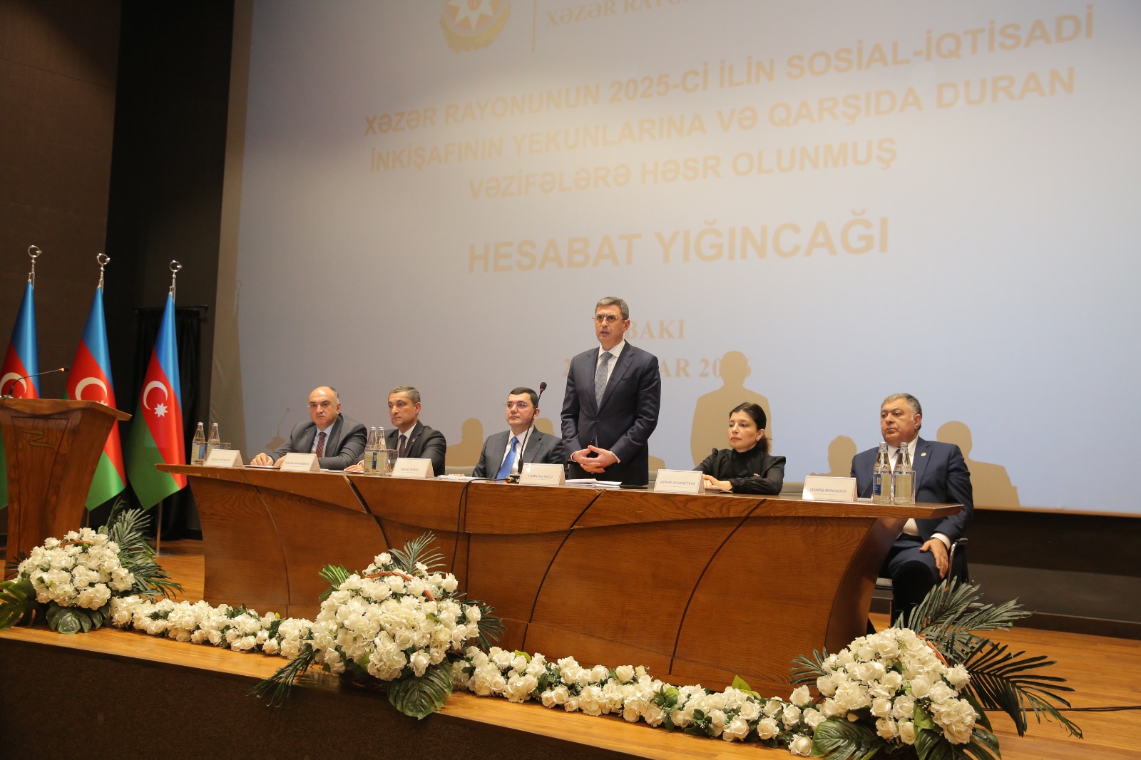Xəzər Rayon İcra Hakimiyyətinin başçısı Elşən Salahov tədbirdə geniş məruzə ilə çıxış edərək 2025-ci il üzrə görülmüş işlər, sosial-iqtisadi nəticələr və qarşıda duran prioritetlər barədə məlumat verib. O qeyd edib ki, 2025-ci il Azərbaycan dövlətçiliyi tarixində mühüm mərhələ kimi yadda qalıb, Azərbaycan Prezidenti İlham Əliyevin həyata keçirdiyi siyasi kursun davamlılığı ölkənin bütün istiqamətləri üzrə sosial-iqtisadi inkişafın yeni mərhələsinə keçidə şərait yaradıb.