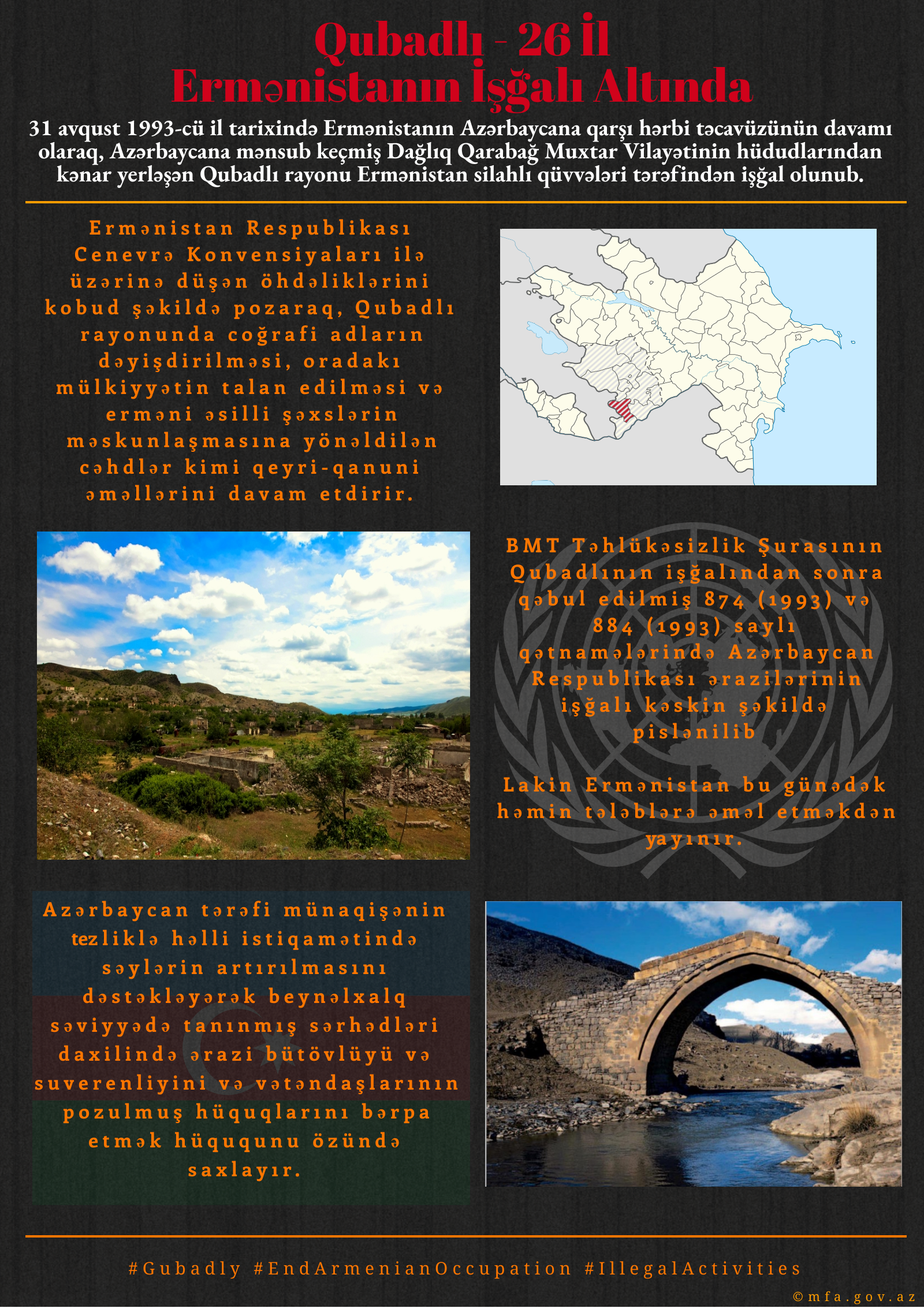 Xəbər verdiyimiz kimi, bu gün Azərbaycanın Qubadlı rayonunun işğalının 26-cı ildönümüdür.