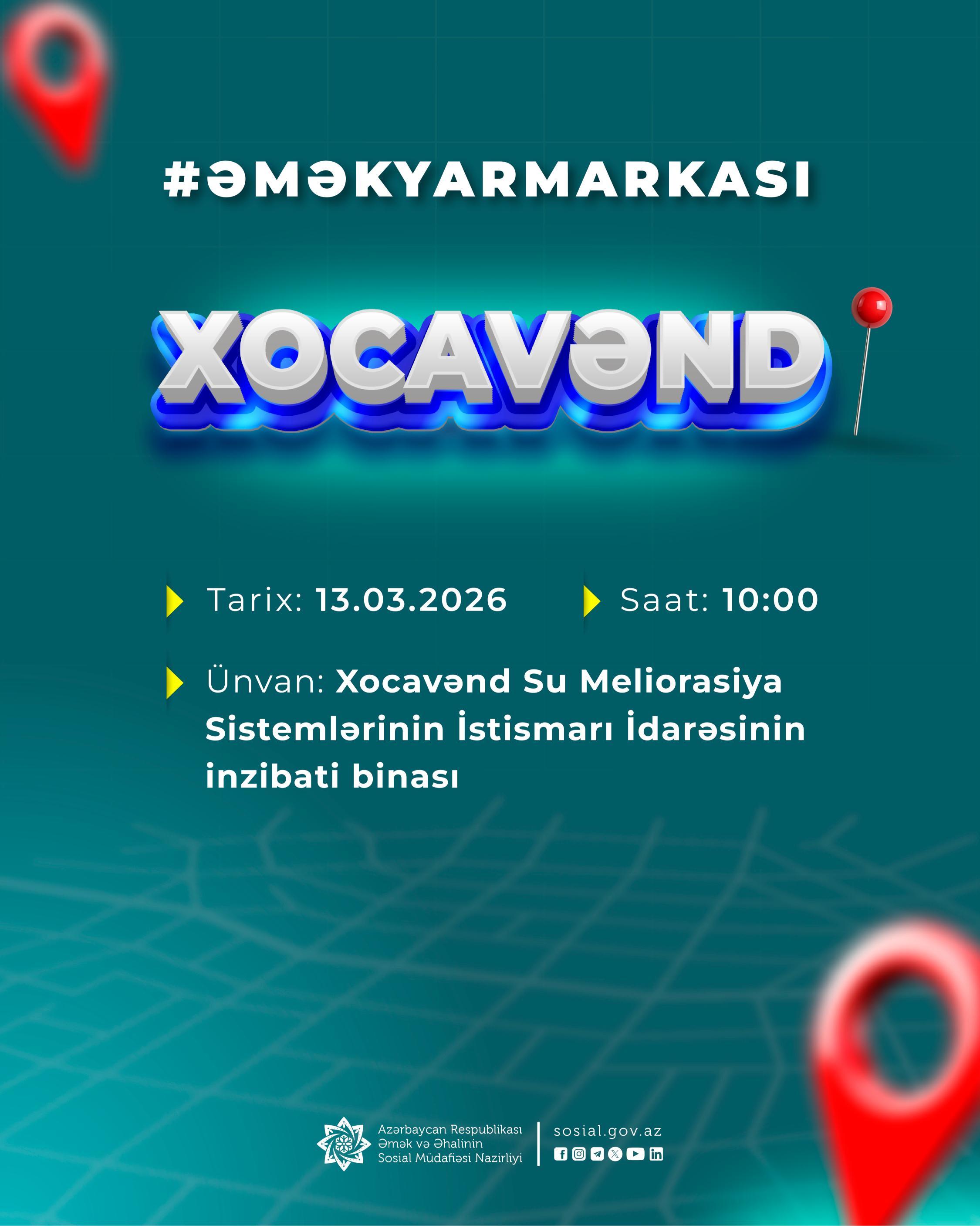 Əmək və Əhalinin Sosial Müdafiəsi Nazirliyinin (ƏƏSMN) tabeliyində Dövlət Məşğulluq Agentliyi və SOCAR-ın Qaz İxrac İdarəsinin birgə təşkilatçılığı ilə Xocavənd şəhərində əmək yarmarkası keçiriləcək.