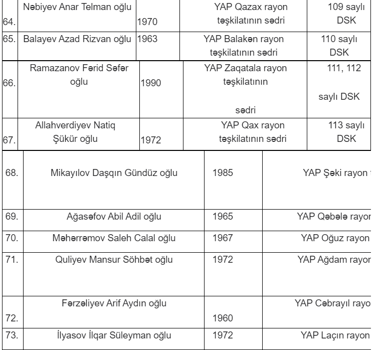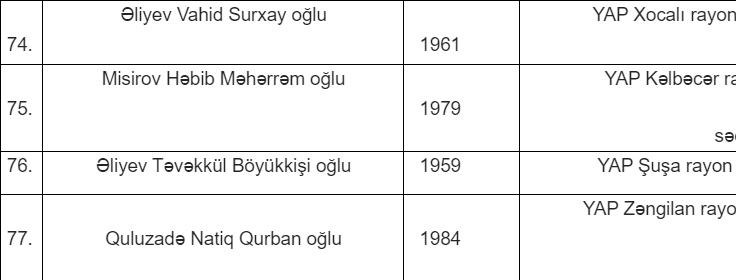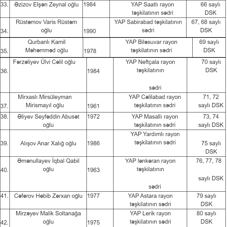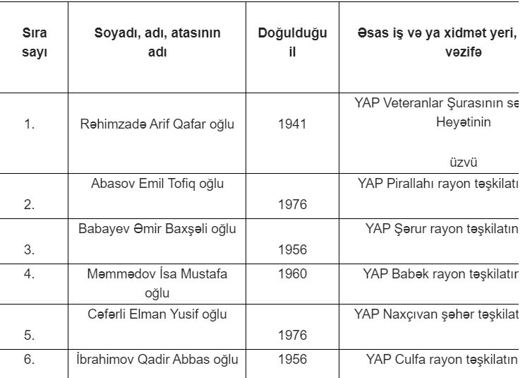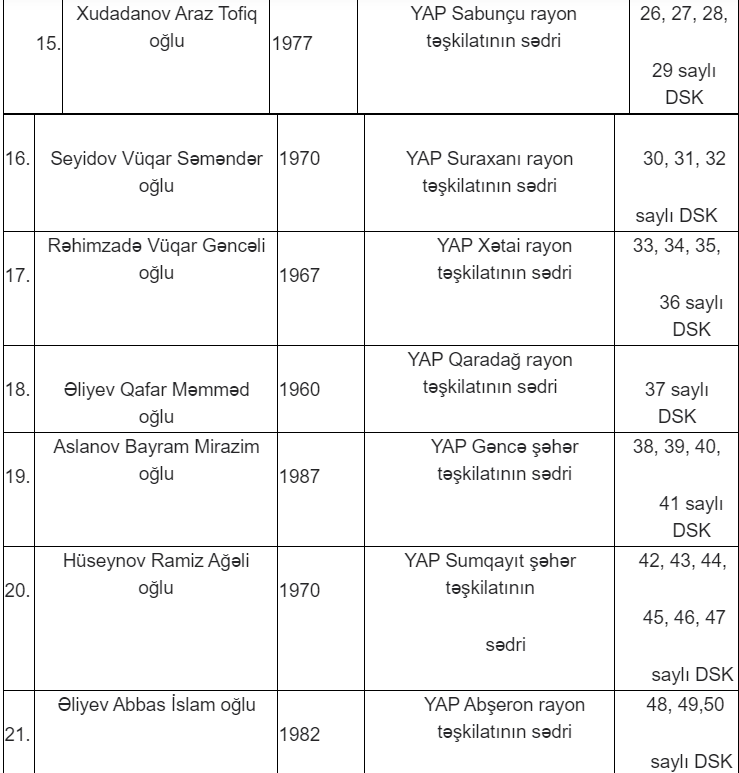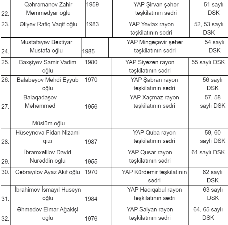 Milli Məclisə keçiriləcək növbədənkənar parlament seçkilərində Yeni Azərbaycan Partiyasının (YAP) səlahiyyətli nümayəndələri və maliyyə məsələləri üzrə səlahiyyətli nümayəndələrinin adları məlum olub.