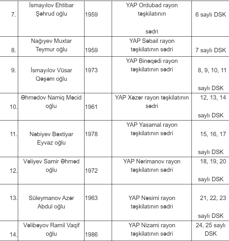 Bundan başqa, Yeni Azərbaycan Partiyasının Mərkəzi Seçki Qərargahı yaradılıb və onun tərkibi təsdiqlənib.