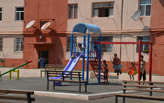 Abadlaşdırılan və 6300 kv.m sahəsi olan həyətdə əlil və sağlamlıq imkanları məhdud insanların rahat hərəkəti və bütün yaş qrupları üzrə uşaqların inkişafı üçün əlverişli şəraitin yaradılması məqsədilə əyləncə qurğuları yerləşdirilib.