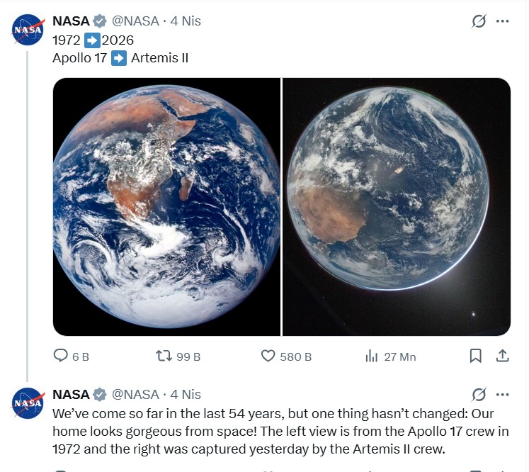 “Qafqazinfo” xəbər verir ki, kosmik agentliyin paylaşımında “Apollo 17” missiyasının heyəti tərəfindən çəkilmiş məşhur Yer fotosu ilə 2026-cı ildə “Artemis II” astronavtlarının çəkdiyi yeni görüntü yanaşı təqdim olunub.