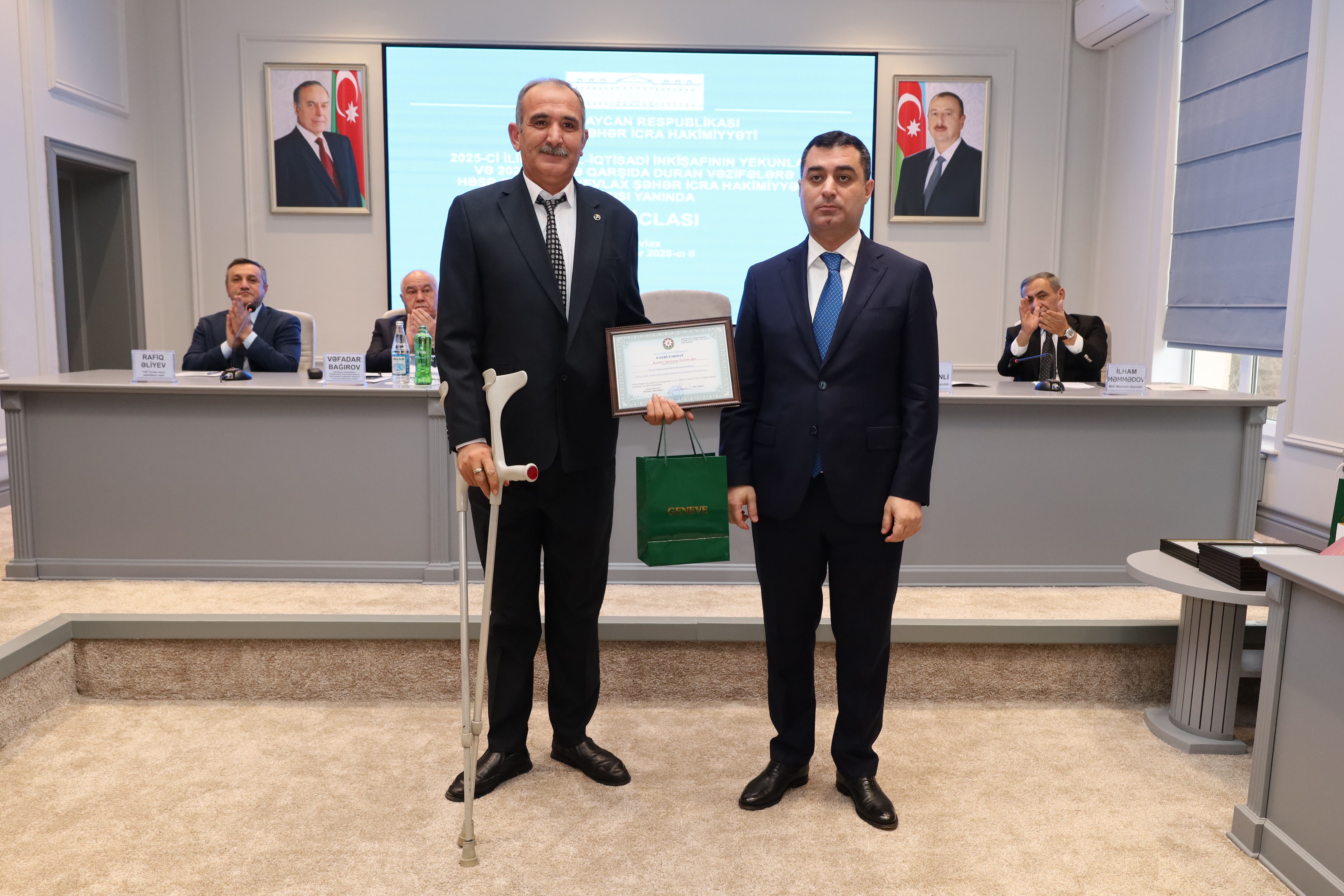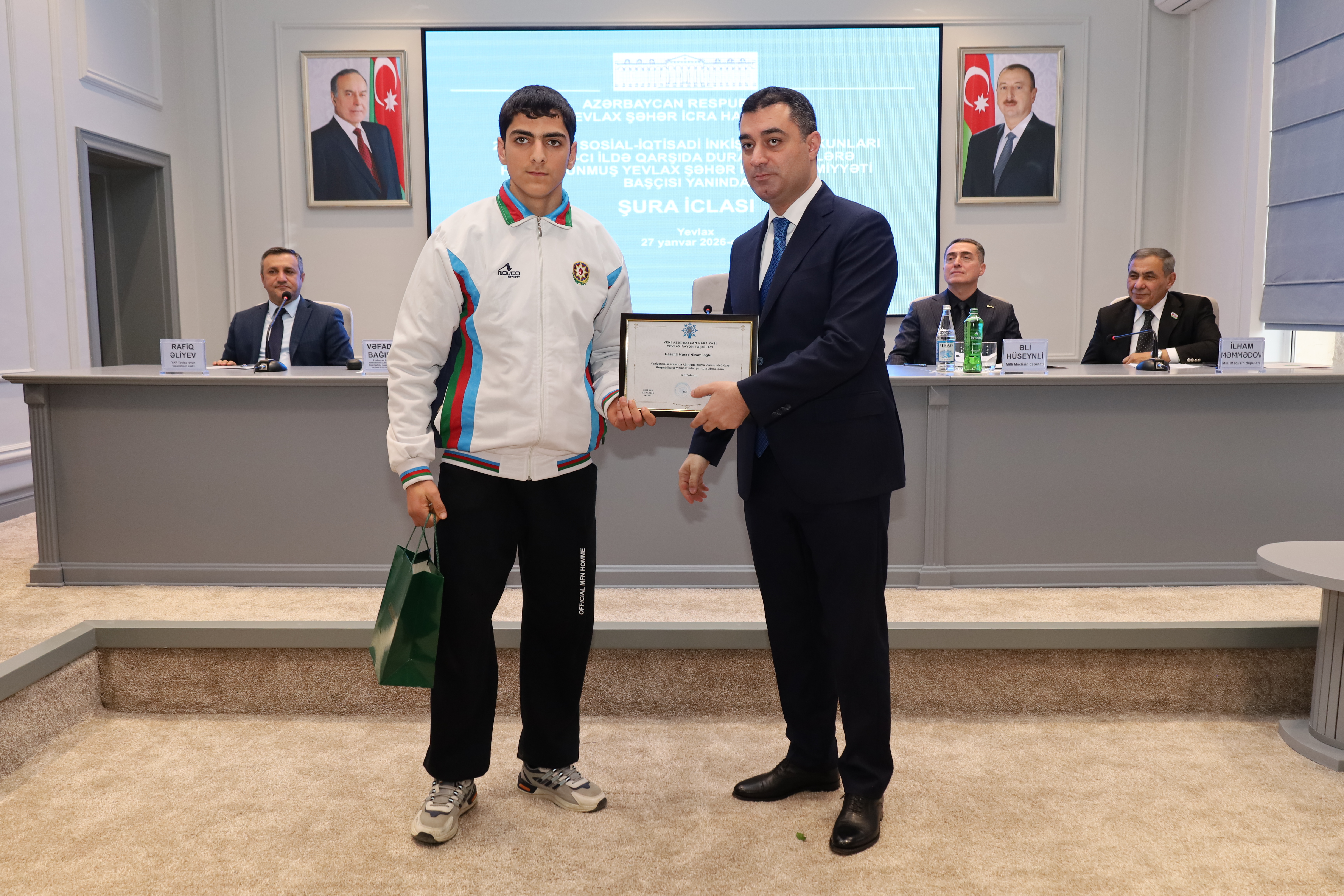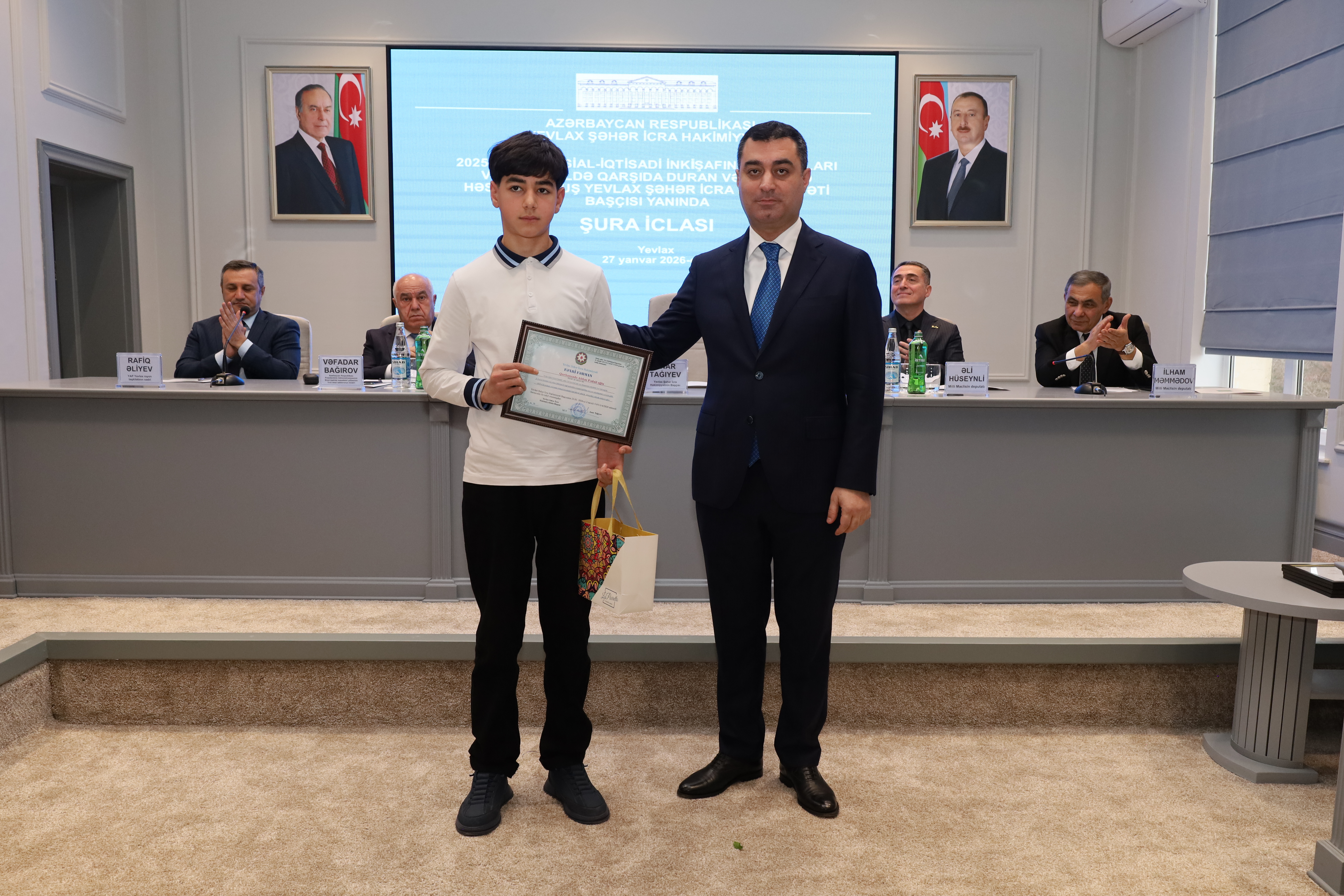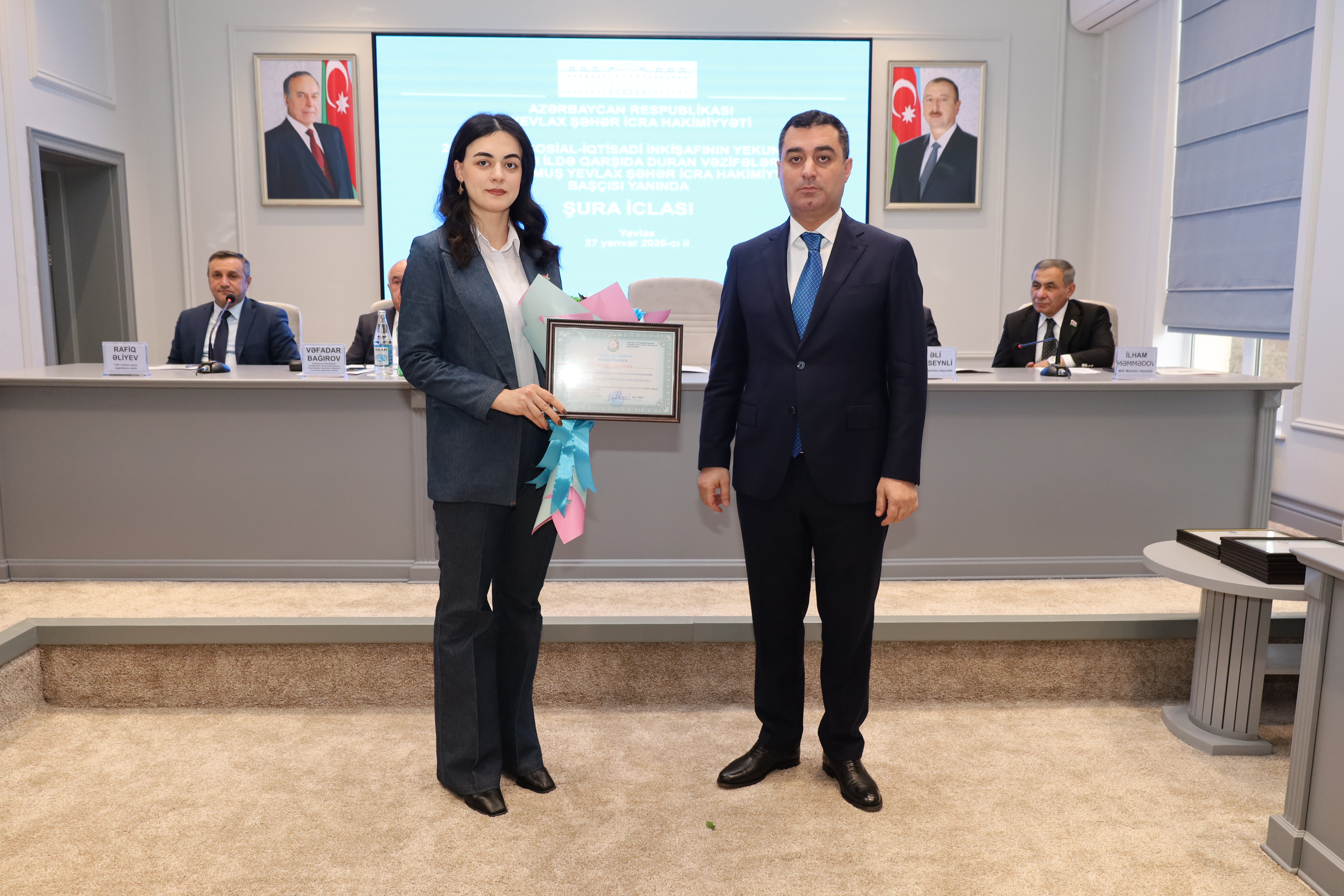 Qeyd edilib ki, Yevlaxda il ərzində geniş sosial-ideoloji və maarifləndirici tədbirlər keçirilib, rayonun iqtisadi göstəriciləri artıb, qeyri-neft sektoru inkişaf etdirilib, yeni istehsal sahələri və iş yerləri açılıb. Yevlax Şəhər İcra Hakimiyyətinin başçısı rayonda görülən abadlıq-quruculuq, tikinti işlərindən, eləcə də kənd təsərrüfatının aparıcı sahəsi olan pambıqçılıq, heyvandarlıq, baramaçılıq və taxılçılıqdan danışıb, məşğulluğun artırılması, sosial rifahın yaxşılaşdırılması istiqamətində görülən işlərdən bəhs edib. Bildirib ki, 2025-ci ildə Yevlaxda abadlıq-quruculuq işləri geniş vüsət alıb, yol, su, elektrik təsərrüfatının yaxşılaşdırılması istiqamətində mühüm addımlar atılıb. Sakinlərin sosial rifah halının yaxşılaşdırılması istiqamətində şəhid ailələri, qazilər və aztəminatlı ailələrə daimi diqqət və qayğı göstərilib, əhalini narahat edən sosial problemlərin həlli ilə bağlı rayonun kənd və qəsəbələrində səyyar görüşlər keçirilib.