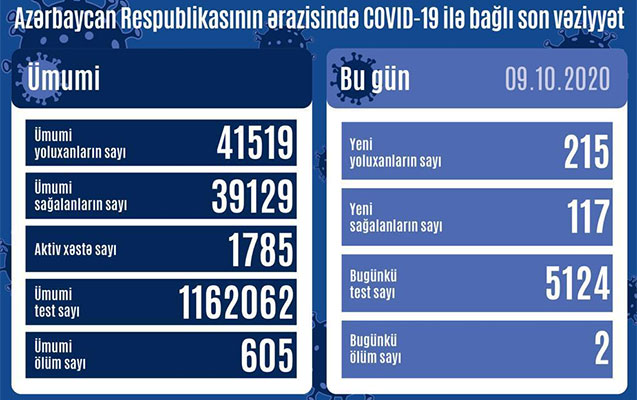 Azərbaycanda bu gün koronavirus infeksiyasına 215 yeni yoluxma faktı qeydə alınıb, 117 nəfər müalicə olunaraq sağalıb və evə buraxılıb.