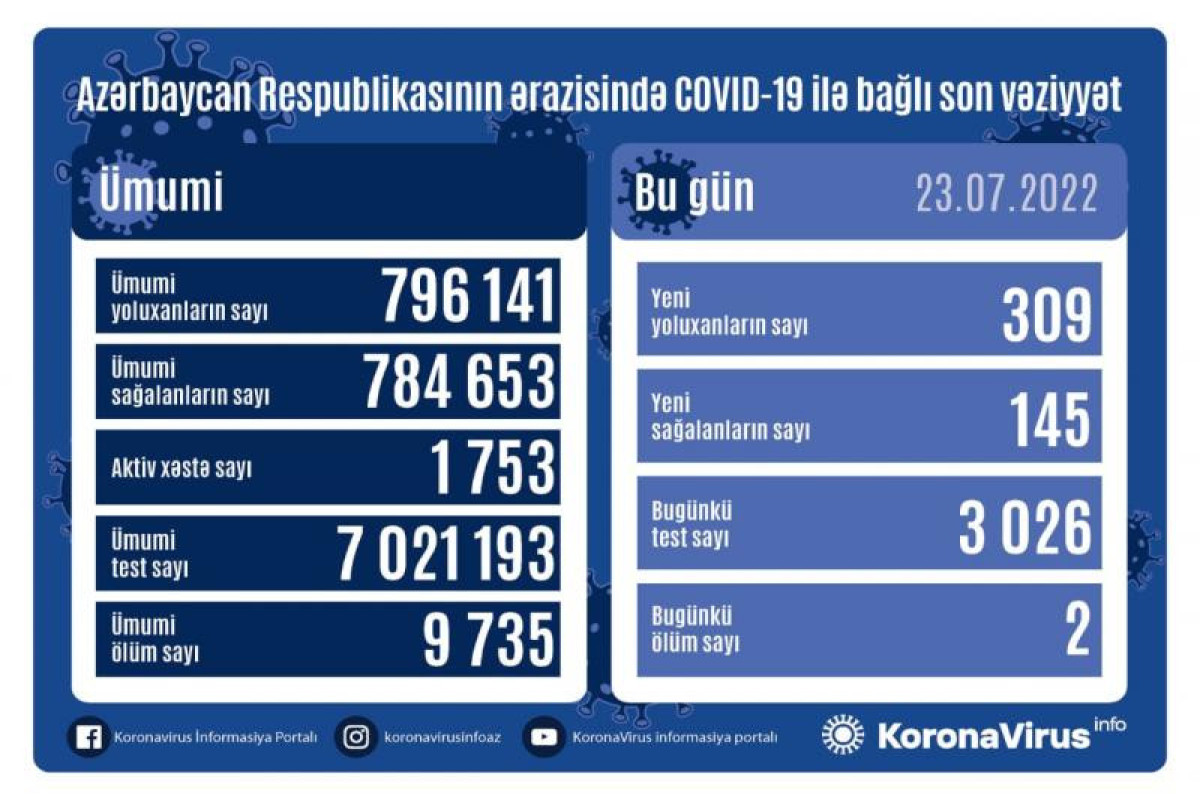 Azərbaycanda son sutkada koronavirus infeksiyasına 309 yeni yoluxma faktı qeydə alınıb, 145 nəfər müalicə olunaraq sağalıb və evə buraxılıb.