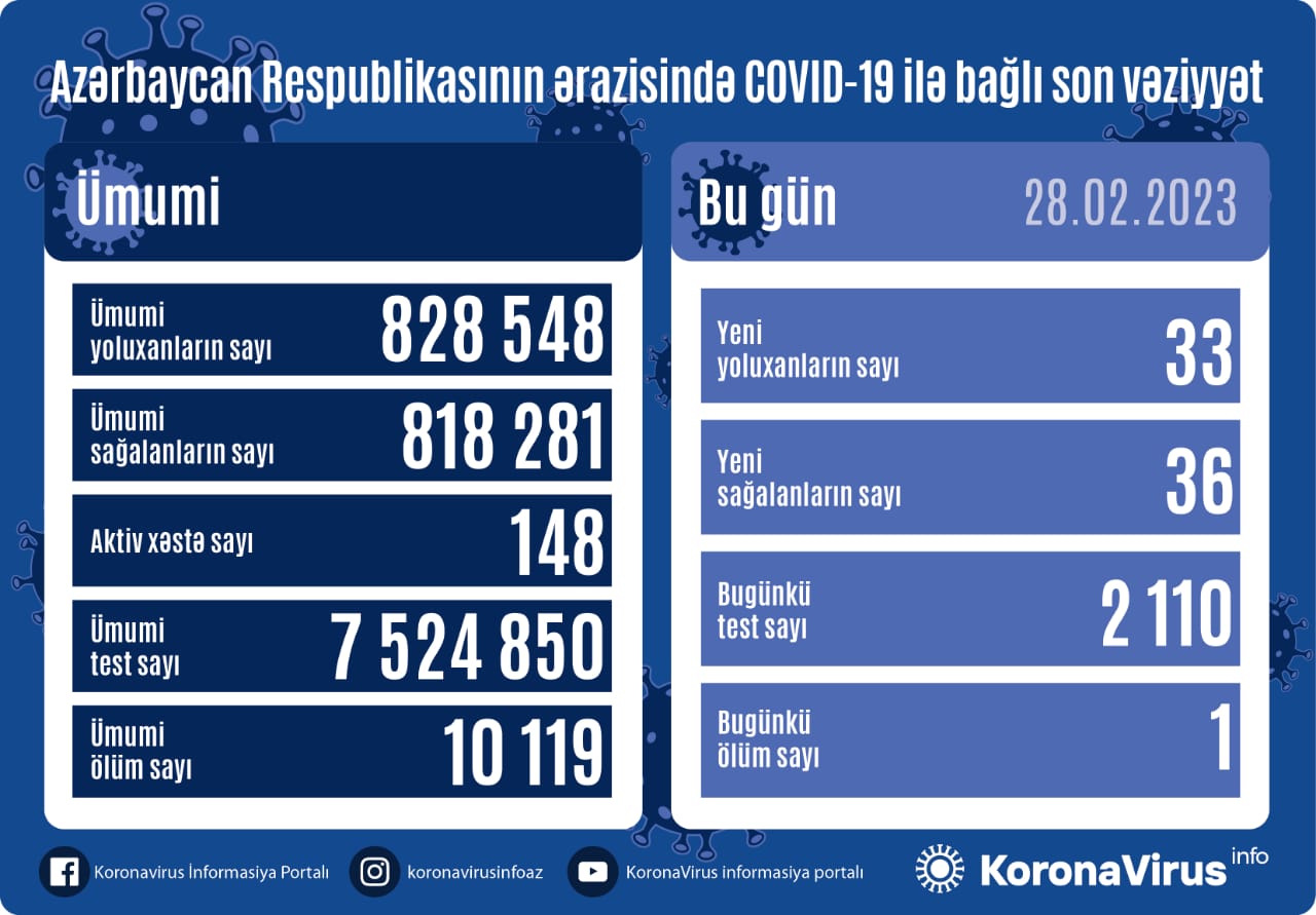 Azərbaycanda son sutkada koronavirus infeksiyasına 33 yeni yoluxma faktı qeydə alınıb, 36 nəfər müalicə olunaraq sağalıb.