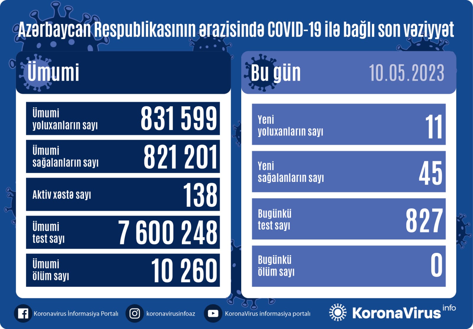 Azərbaycanda koronavirus infeksiyasına 11 yeni yoluxma faktı qeydə alınıb, 45 nəfər müalicə olunaraq sağalıb.