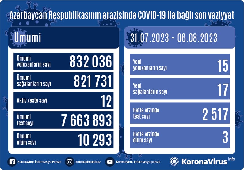Azərbaycanda son həftədə koronavirus infeksiyasına 15 yeni yoluxma faktı qeydə alınıb.