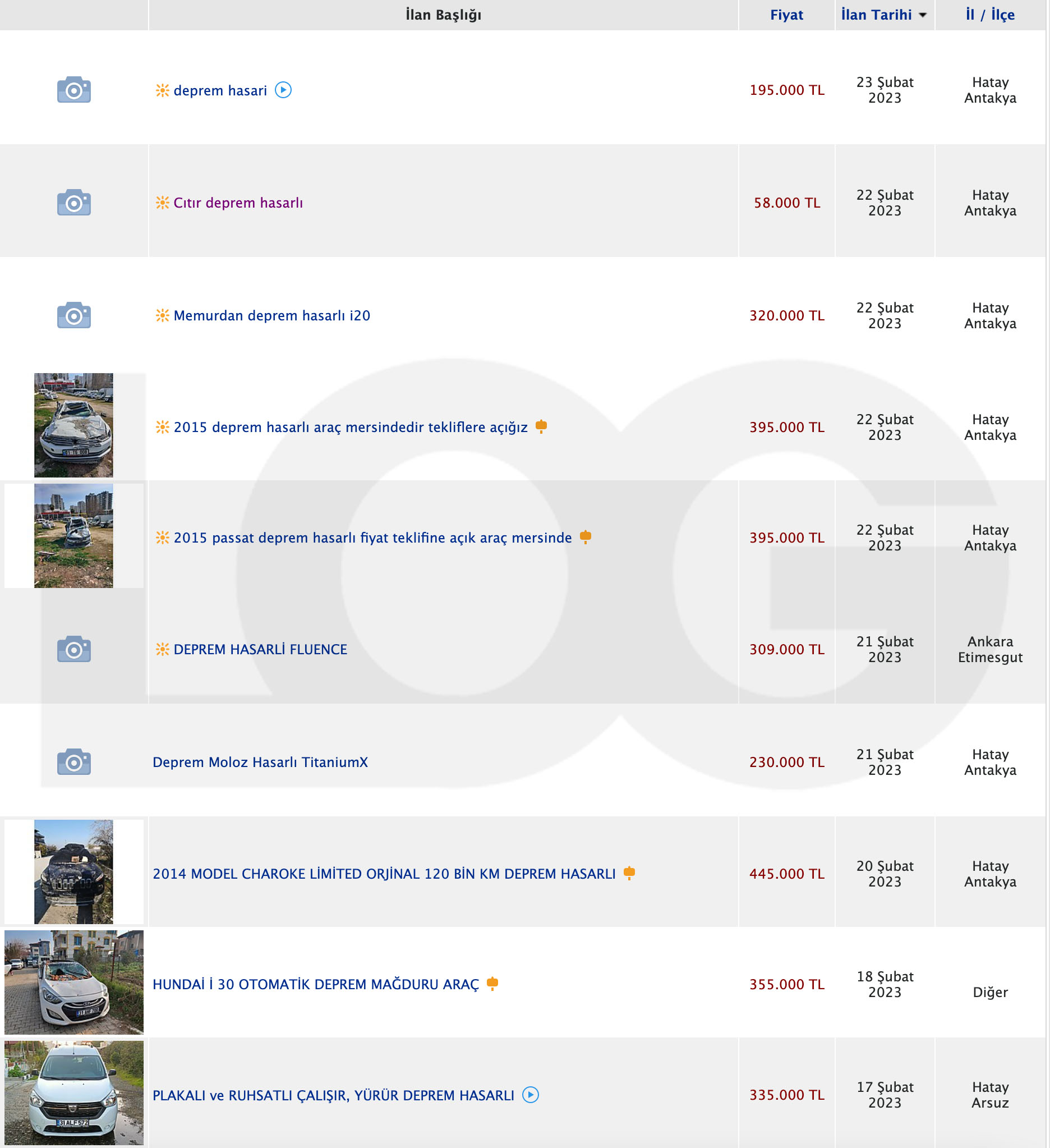 “Qafqazinfo” “Hürriyet”ə istinadən xəbər verir ki, Kahramanmaraş, Hatay və Adıyamanda bir çoxları zəlzələ nəticəsində zərər görən və hətta yararsız hala düşən avtomobillərini satmağa başlayıb.