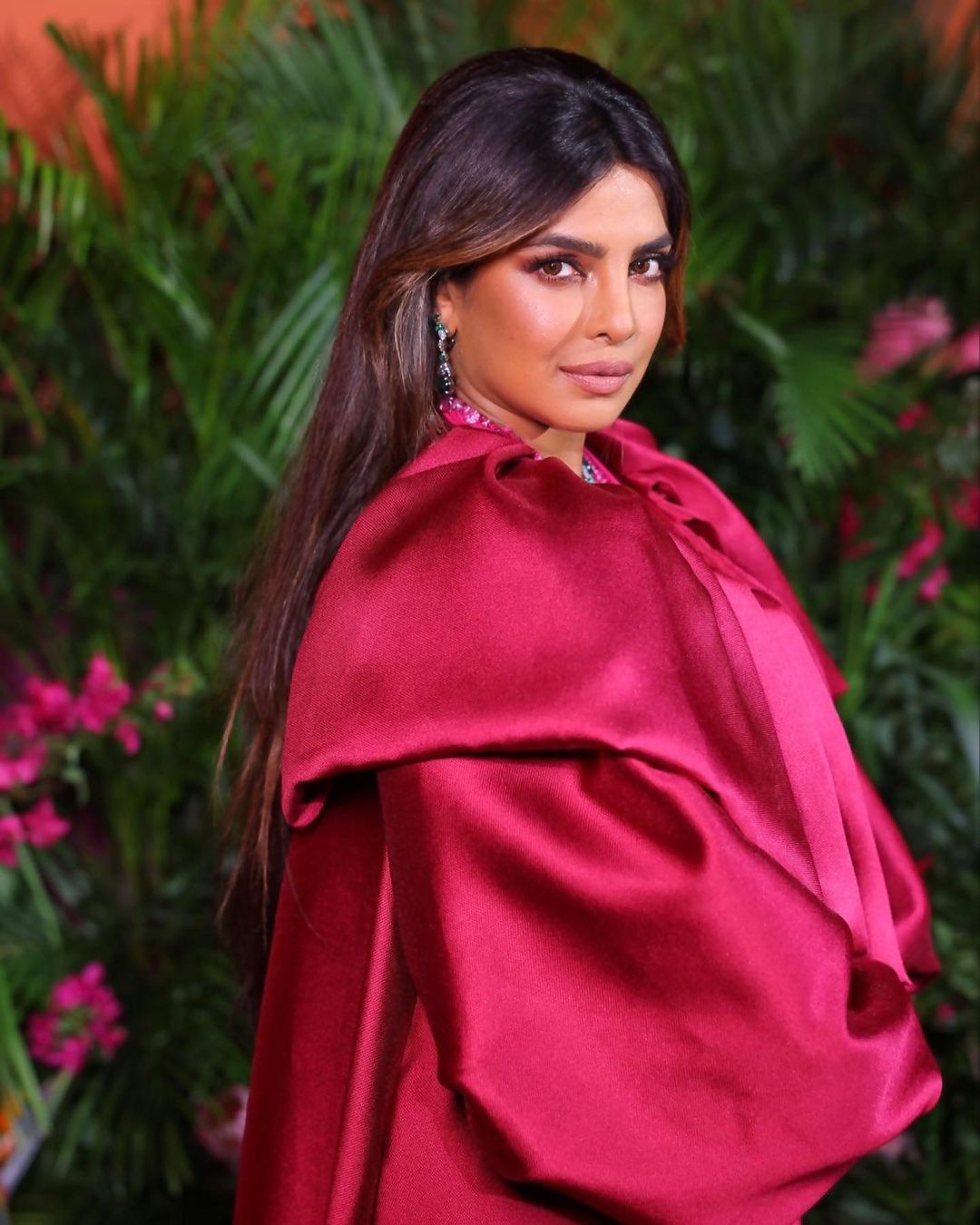 Как передает "Qafqazinfo", она появилась на вечеринке в платье цвета фуксии. Свой образ Приянка завершила длинным пальто из тафты и шелка с объемными рукавами, длинным шлейфом и многослойным воротником. Из аксессуаров Чопра выбрала туфли на высоком каблуке, серьги-подвески с бриллиантами и изумрудами от Bvlgari, колье и кольцо.