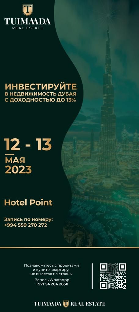 12-13 мая в отеле Point пройдёт долгожданная выставка недвижимости Дубая в Баку от команды Евгении Винокуровой.