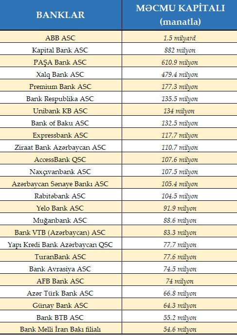 Минимальная сумма совокупного капитала банка должна составлять 50 миллионов манатов. В совокупный капитал включаются только финансовые инструменты, оплачиваемые лишь денежными средствами.