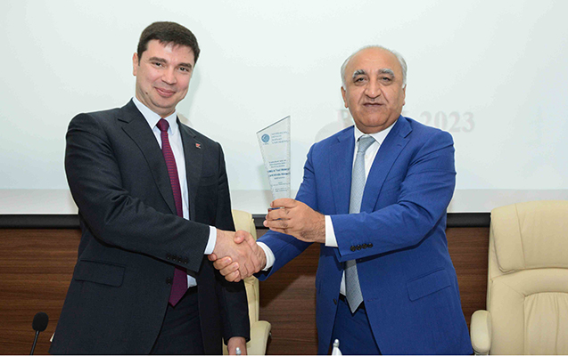 В завершение мероприятия ректор UNEC Адалат Мурадов добавил, что Фарид Гусейнов является одним из самых достойных выпускников UNEC, и вручил ему плакетку «Почетный выпускник» и «Карту выпускника».