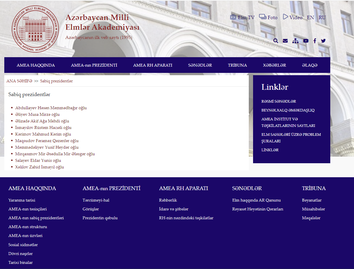 Как сообщает "Qafqazinfo", в разделе "О НАНА" на сайте учреждения science.gov.az указаны имена 10 бывших президентов, но имя Р.Мехтиева нет.