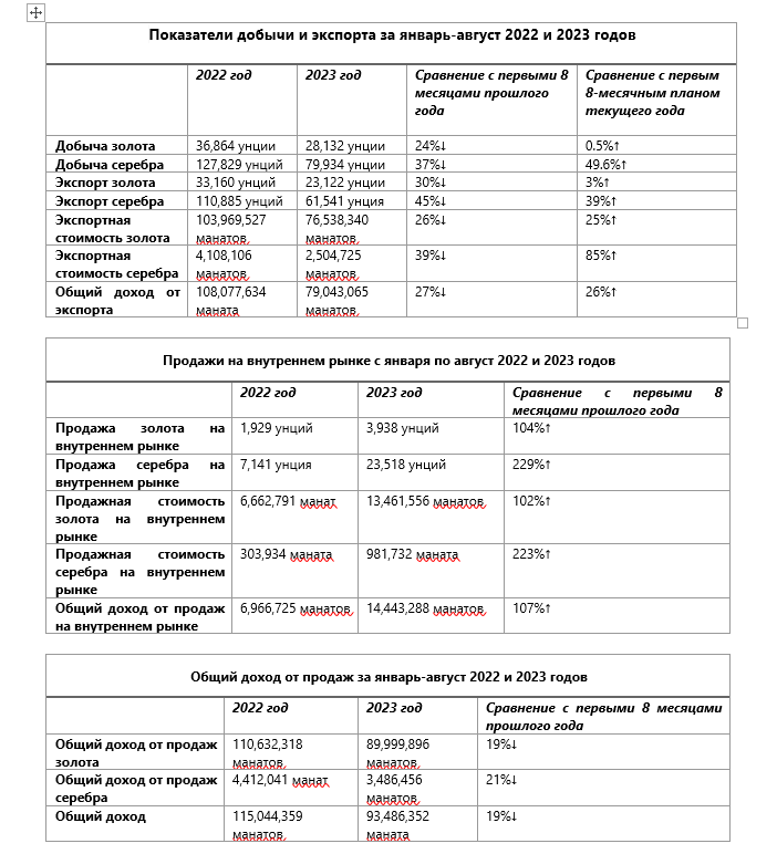 Отметим, что по состоянию на 1 сентября 2023 года общий доход ЗАО в результате реализации драгоценных металлов на внутреннем и внешнем рынках достиг 1 млрд. 49 млн. 202 тыс. манатов. 1 млрд. 6 млн. 40 тыс. манатов из полученных средств формируют экспортные доходы, а 43 млн. 162 тыс. манатов –доходы от продаж на внутреннем рынке.