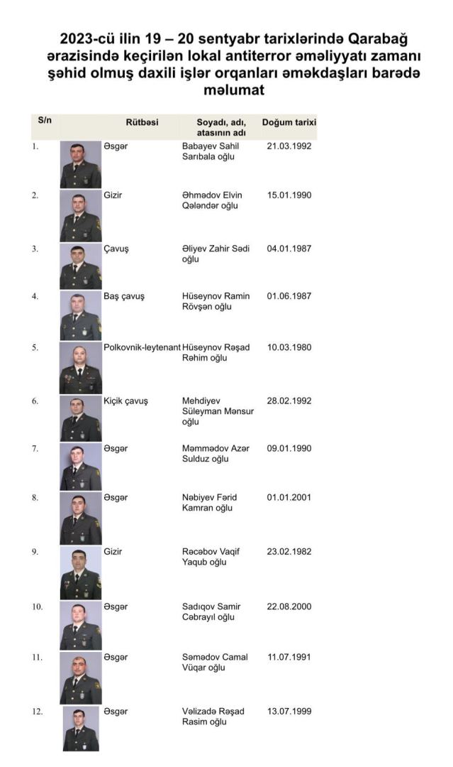 Опубликован список сотрудников МВД Азербайджана, погибших в ходе антитеррористических мероприятий в Карабахе, сообщает Qafqazinfo.