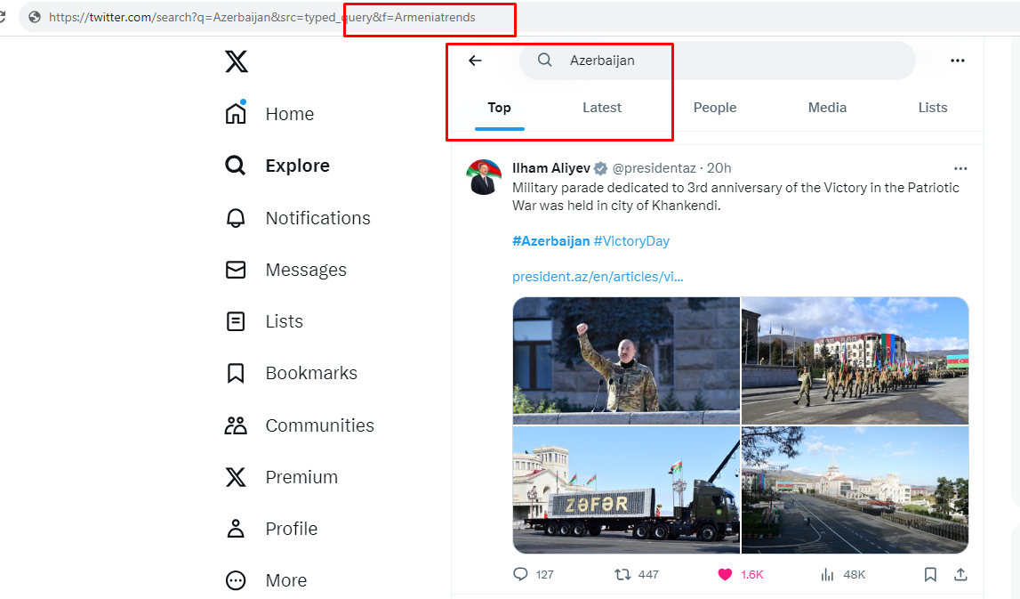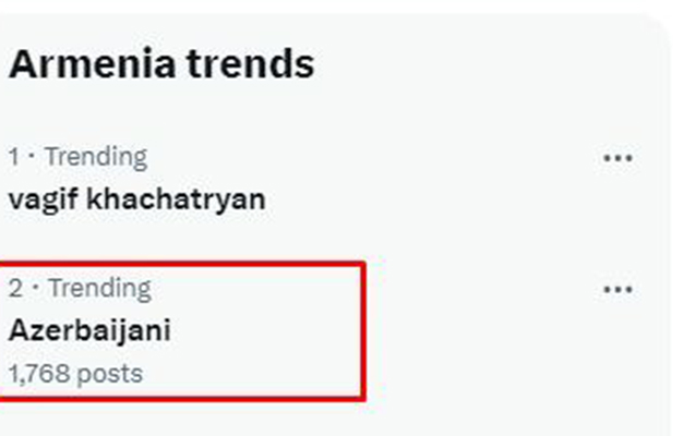 В частности, тенденцией среди армянских пользователей социальных сетей стали парад Победы, проведенный азербайджанской армией в Ханкенди, и выступление президента Ильхама Алиева во время парада.