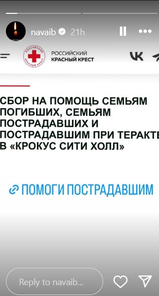 Экс-солист дуэта HammAli&Navai Наваи Бакиров, выступающий в российском шоу-бизнесе под псевдонимом Наваи, оказал материальную помощь пострадавшим во время теракта в торговом центре Crocus City Hall в Москве.