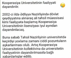 "Сначала данное сообщение было опубликовано в мессенджере Telegram, а затем в социальной сети TikTok. Оно было написано одним из студентов с целью получения лайков и комментариев. Какой-либо информации о закрытии вуза нашим сотрудникам не предоставлялось, соответствующих проверок не проводилось. Распространяемые по этому поводу в азербайджанском сегменте Сети сообщения не имеют под собой никакой основы", - отмечается в заявлении.