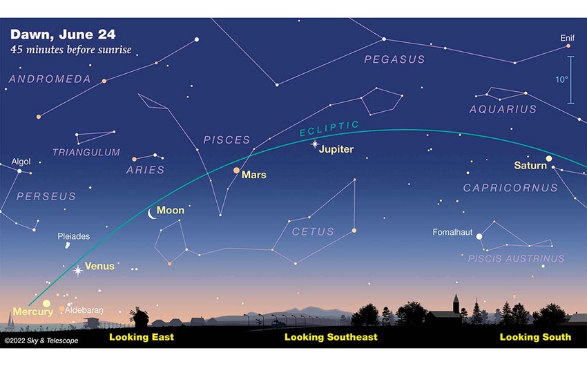 Парад планет 24 июня 2022 года - это редкое астрономическое событие. Меркурий, Венера, Марс, Юпитер и Сатурн выстроились на небе в ровную линию, а спутник Земли до конца месяца будет передвигаться от одной планеты к другой.
