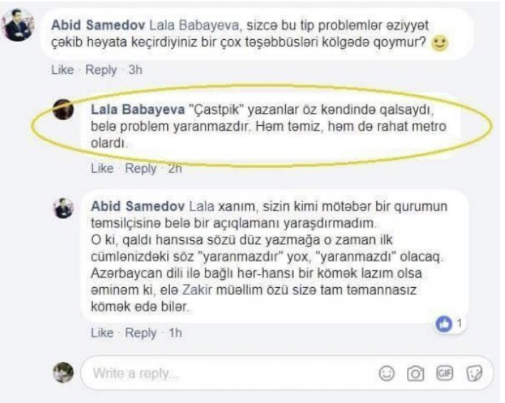 “Если бы те, кто пишет “Çastpik” (час пик - ред.) оставались в своих селах, такой проблемы бы не возникло”, - говорилось в скандальном комментарии в связи с плотностью пассажиропотока на станциях метро. Позже Бабаева извинилась, заявив, что написанное ею было неправильно истолковано.