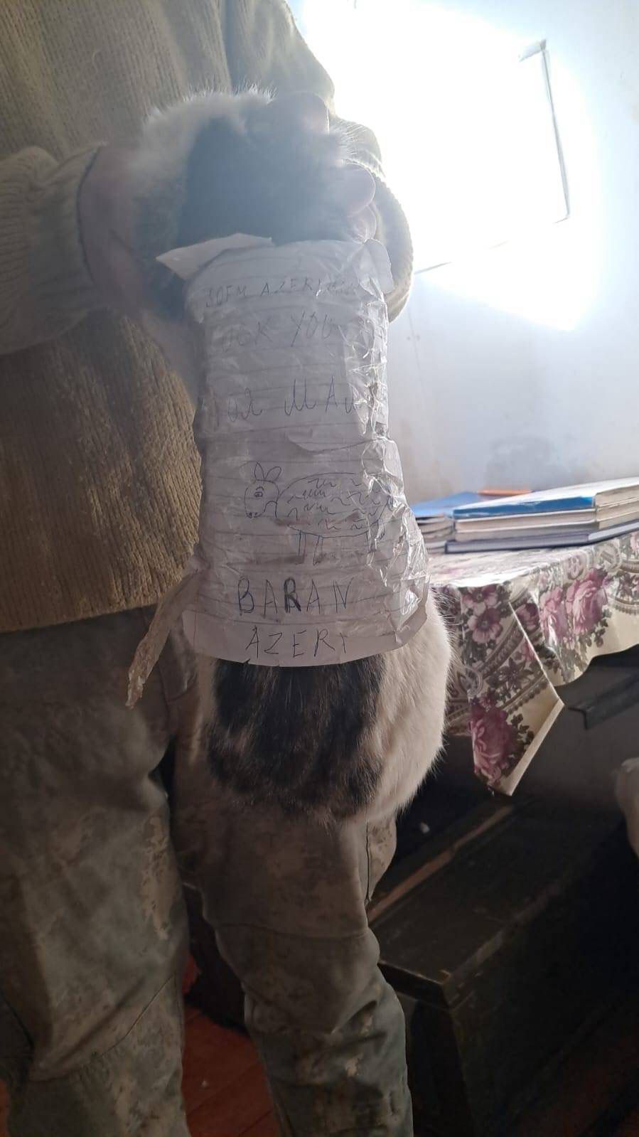 Несколько дней назад армянский солдат, проявляя оскорбительные действия, бросал камни в направлении поста нашей армии. На этот же раз армянские вояки умудрились прикрепить к туловищу кошки листок бумаги с написанными на нем нецензурными словами, и направить ее в сторону нашего поста.