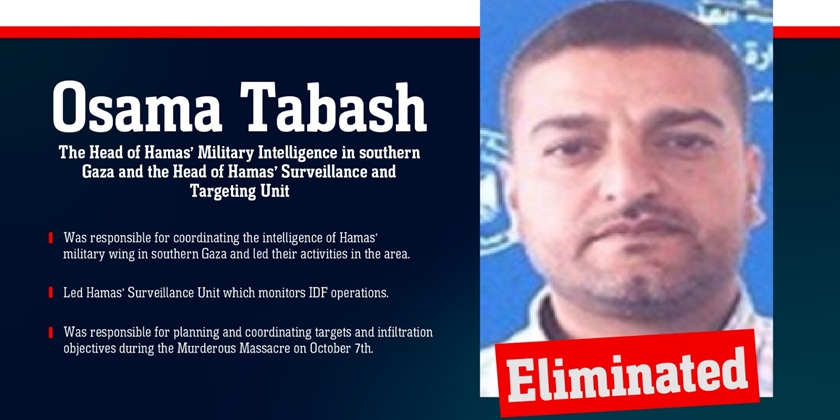 "Армия обороны Израиля уничтожила ударом террориста Усаму Табаша, который являлся главой военной разведки ХАМАС на юге Газы и главой подразделения по наблюдению и корректировке огня ХАМАС", - говорится в заявлении.