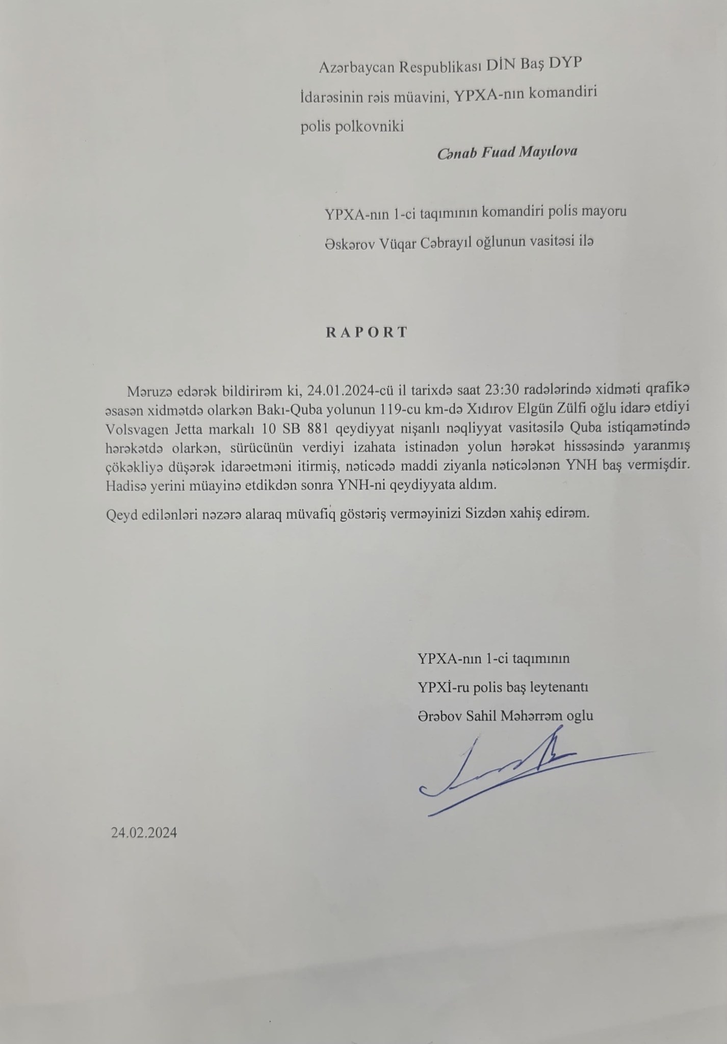 Инцидент был зафиксирован около года назад, когда он ехал в Хачмаз. У автомобиля Хыдырова лопнуло колесо после попадания в выбоину на 119-м км трассы М1 в Шабранском районе.