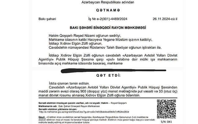 Как передает “Qafqazinfo”, Эльгюн Хыдыров выиграл в суде дело против Государственного агентства автомобильных дорог Азербайджана (ГААДА).