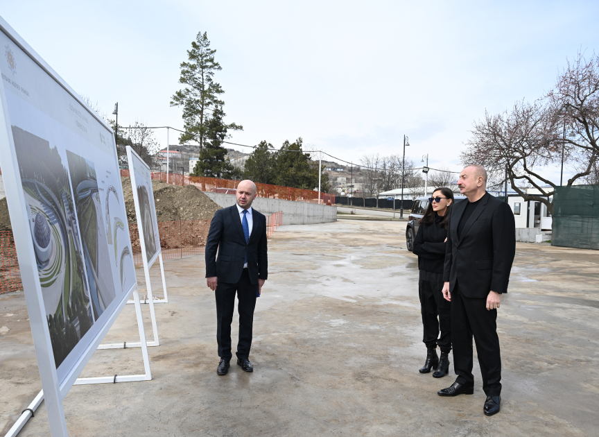 Затем Президент Ильхам Алиев и первая леди Мехрибан Алиева ознакомились с ходом строительных работ в Новой Шушинской мечети.