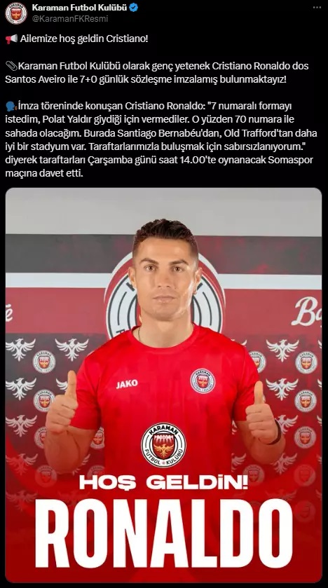 Так, ФК "Караман" объявил на своих официальных страницах в социальных сетях, что достиг соглашения с Криштиану Роналду. Это заявление клуба вызвало большой резонанс, и когда футбольные фанаты поняли, что это шутка на 1 апреля, они начали оставлять веселые комментарии.
