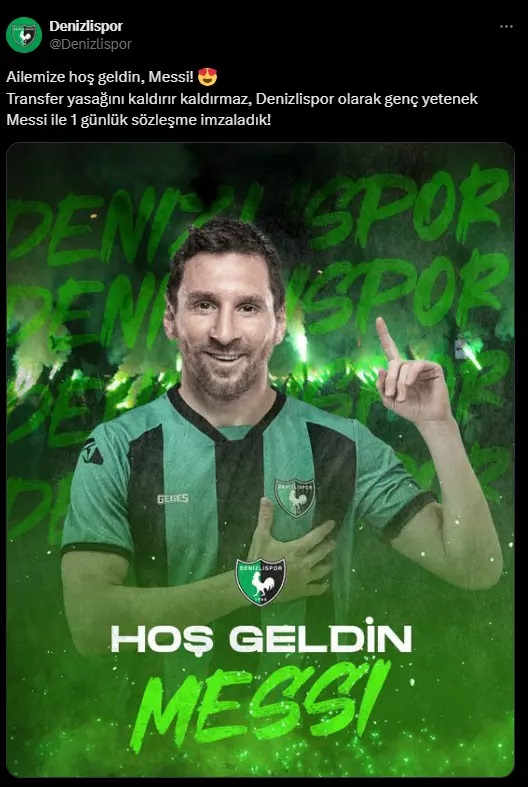 Ответ на ход ФК "Караман" с Роналду не заставил себя долго ждать. ФК "Денизлиспор" объявил о подписании однодневного контракта со всемирно известной аргентинской звездой Лионелем Месси. В сообщении на официальной странице клуба в социальных сетях говорится: "Добро пожаловать в нашу семью, Месси!".