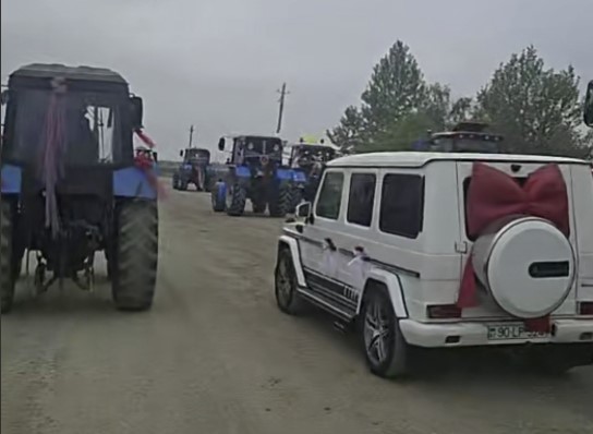 В Агдамском районе за невестой прибыл свадебный кортеж из тракторов.