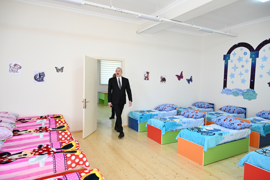 Затем Президент Азербайджана Ильхам Алиев принял участие в открытии яслей-детского сада в селе Кенгерли.