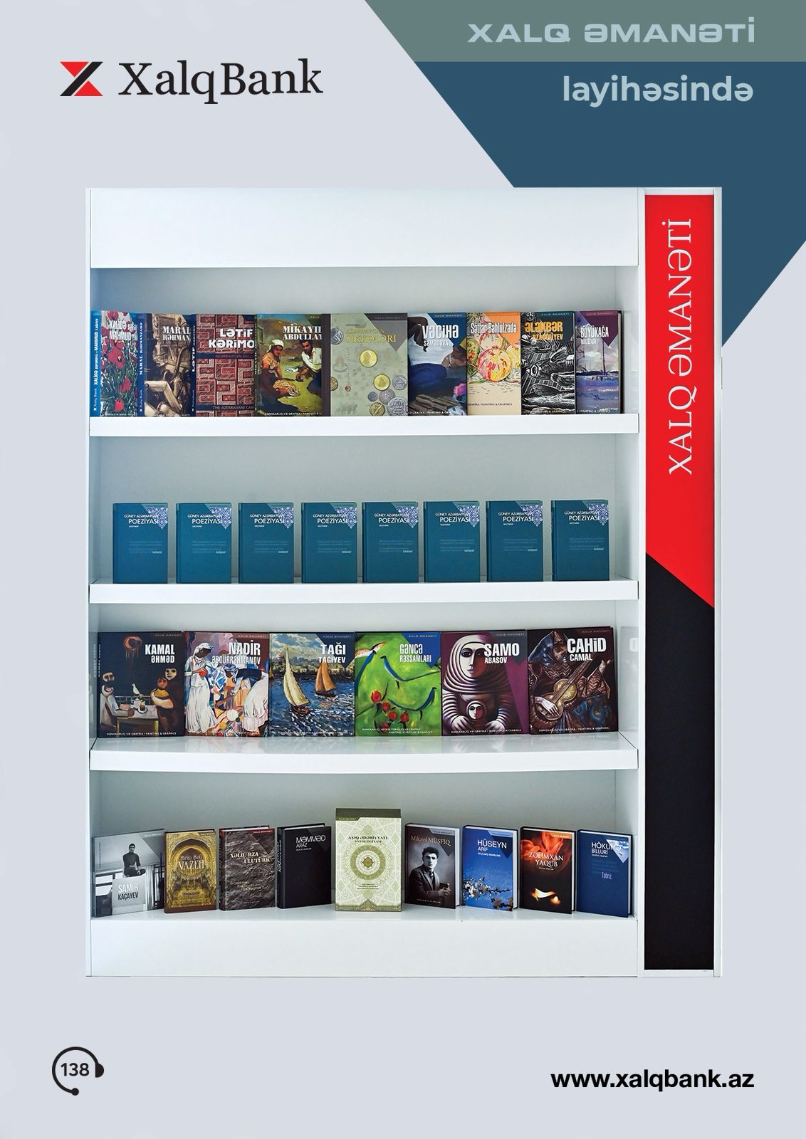 Также вышли в свет избранные произведения народных поэтов Мамеда Араза, Гусейна Арифа, Халила Рзы Улутюрка, Залимхана Ягуба, незабвенного Микаила Мушвига, книга “Монеты Азербайджана” выдающегося ученого-нумизмата, профессора Али Раджабли, трехтомник “Антология ашыгской литературы”, сборник произведений Акимы Биллури, в том числе все произведения всемирно известного поэта-мыслителя Мирзы Шафи Вазеха на азербайджанском, немецком и русском языках.