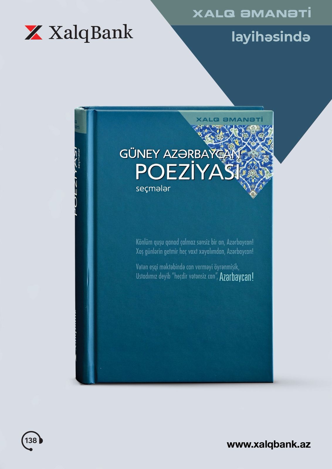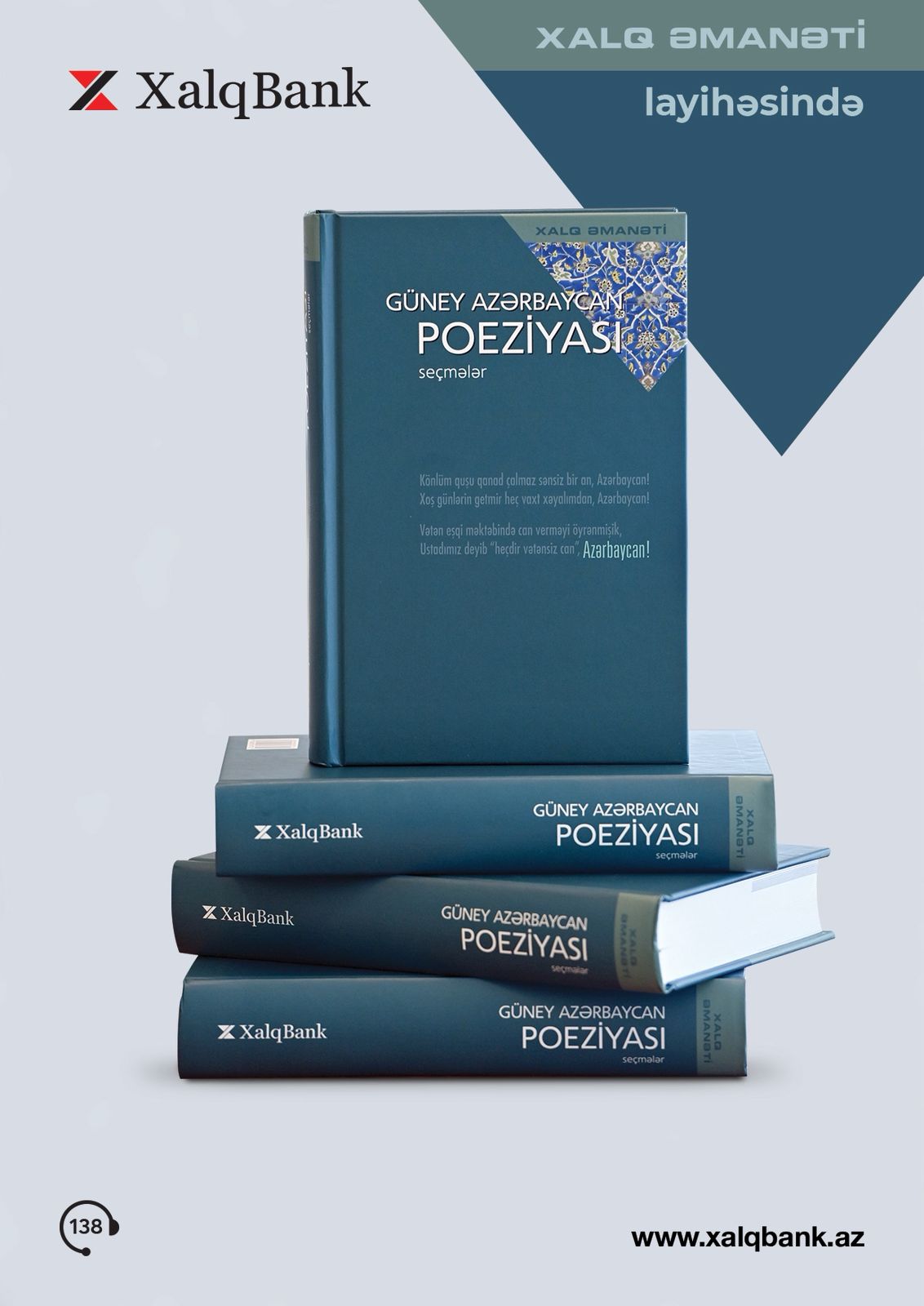 Очередное издание посвящено поэзии Южного Азербайджана. В книге собраны избранные стихи и поэмы, а также газели, написанные 50 азербайджанскими поэтами, родившимися в Южном Азербайджане, творившие в период с начала XX века до наших дней, представляющими различные литературные направления и течения. Среди авторов, наряду с нашими великими мастерами пера вписавшими свои имена в историю Азербайджанской литературы, есть и имена талантливых молодых поэтов современности. Изданная с целью представления литературной среды целого Азербайджана ХХ-ХХI веков книга ”Поэзия Южного Азербайджана. Избранные”, также в точности отражает нашу историю.