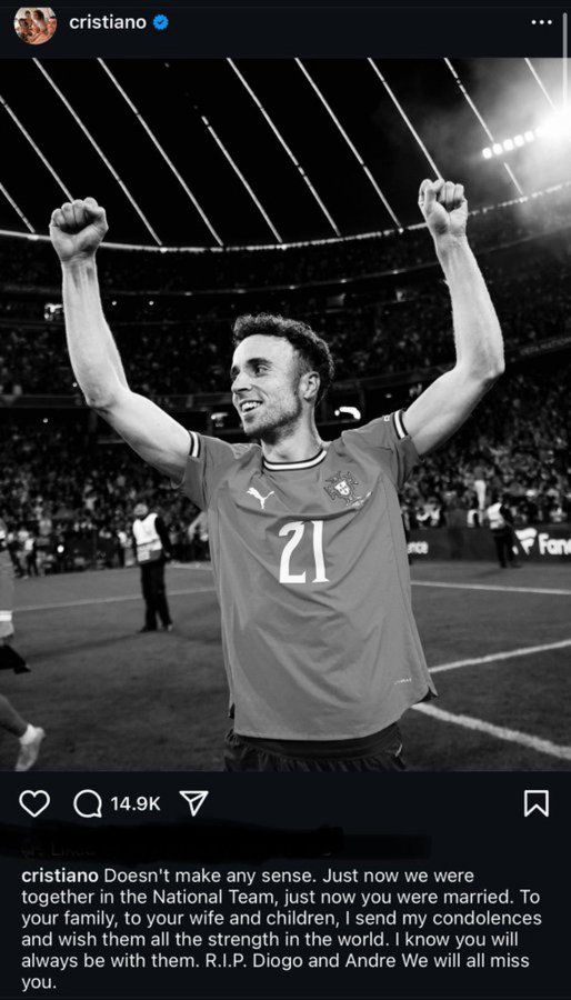"Мы только-только были вместе в сборной, ты только-только женился. Выражаю соболезнования твоей семье, твоей жене и твоим детям и желаю им всех сил в мире. Я знаю, что вы всегда будете с ними. Покойтесь с миром, Диогу и Андре. Мы все будем скучать по вам", - написал Роналду.